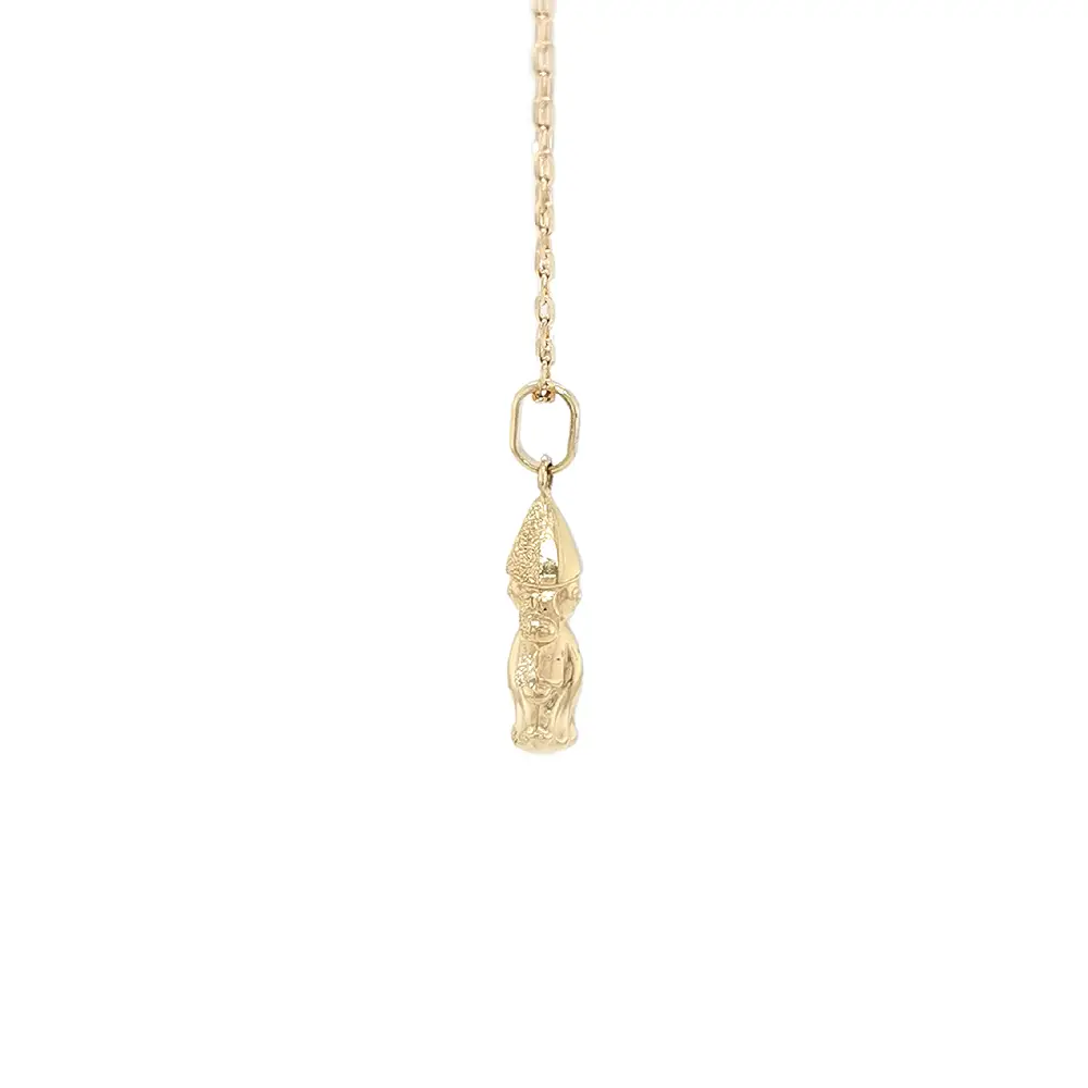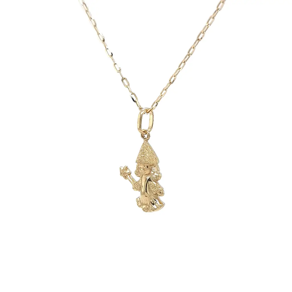 Mặt dây chuyền vàng tinh tế với hình nàng tiên cầm đũa phép gây ấn tượng bởi phong cách cổ tích và các chi tiết được chế tác tỉ mỉ. Ánh vàng thanh lịch làm nổi bật hình dáng nổi của nhân vật, mang đến vẻ đẹp nhẹ nhàng và vượt thời gian.