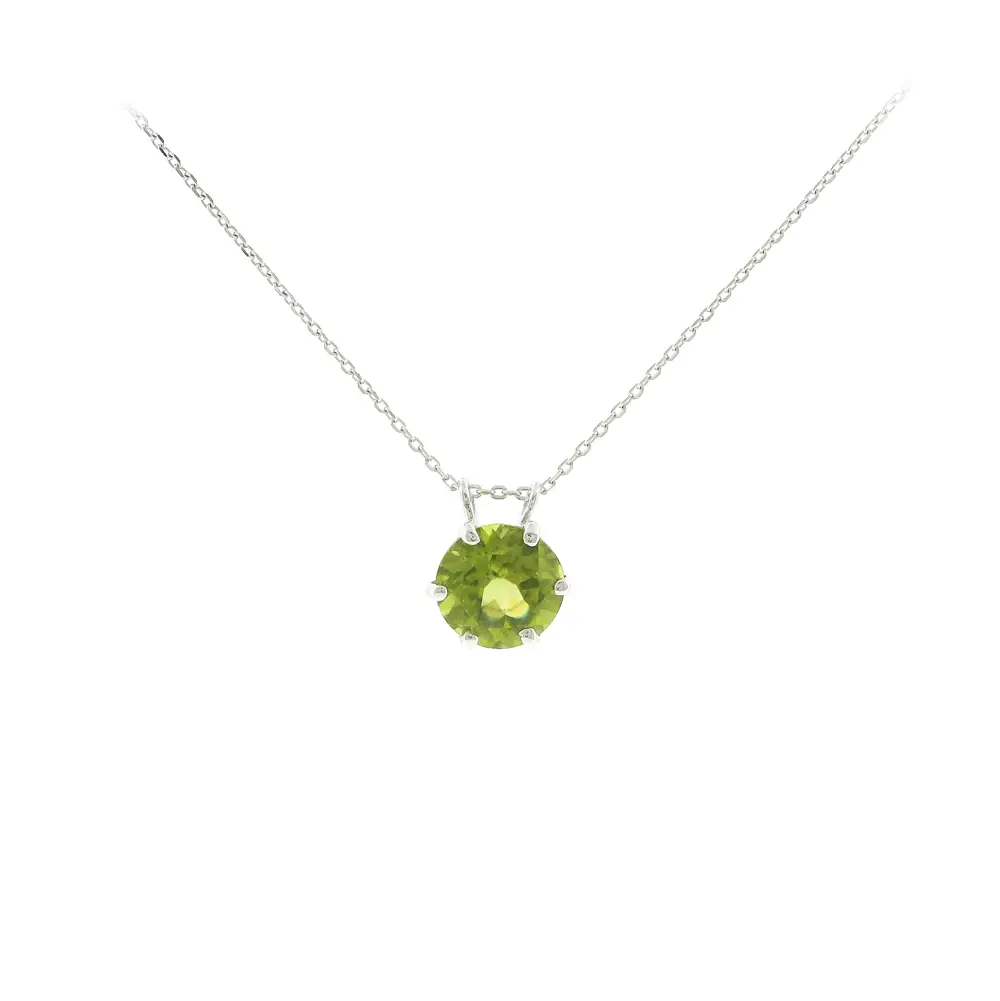 Mặt dây chuyền vàng trắng với đá peridot tự nhiên 2,00 ct gây ấn tượng với màu sắc tươi sáng và thiết kế thanh lịch vượt thời gian. Viên peridot cắt tròn được đặt trong ngàm sáu chấu, giúp giữ đá chắc chắn và làm nổi bật độ lấp lánh tự nhiên. Thiết kế tối giản bằng vàng trắng tôn lên vẻ đẹp của viên đá quý.