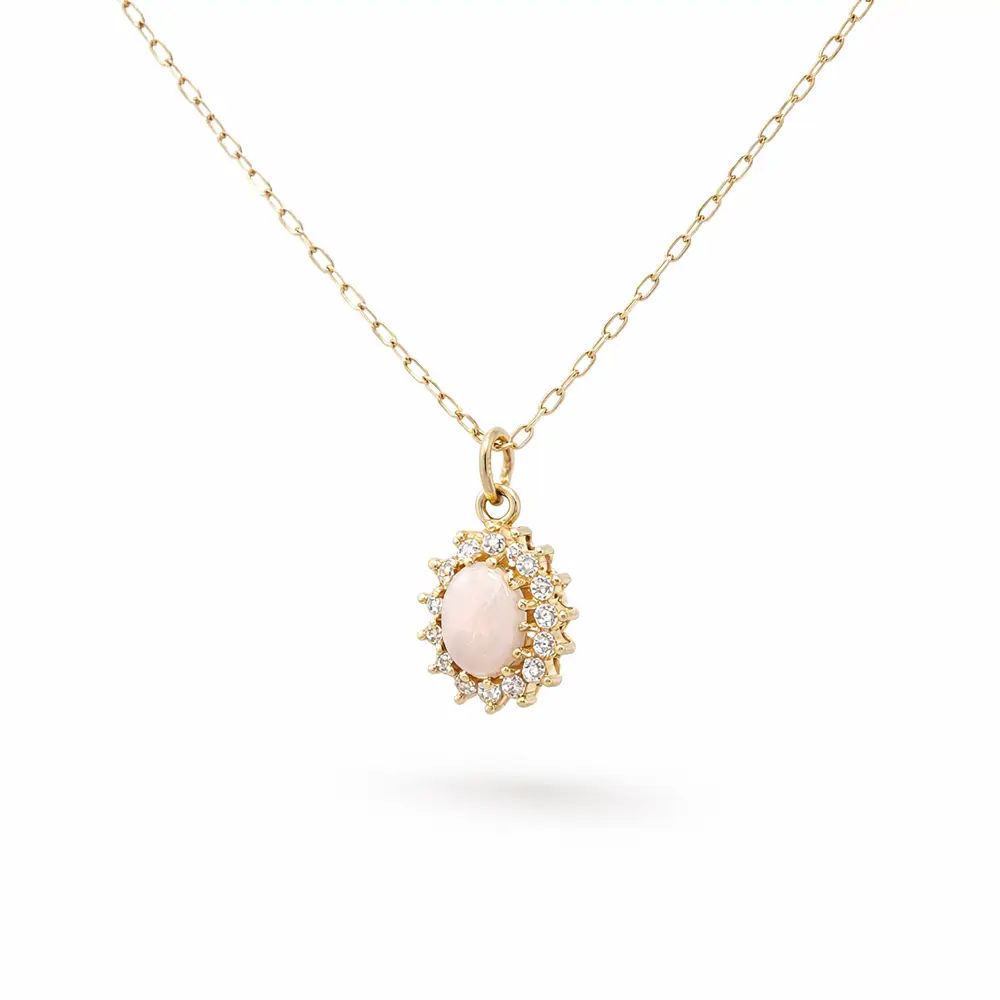 Mặt dây chuyền vàng đính opal và zirconia mang vẻ đẹp tinh tế và thanh lịch nhờ sự kết hợp hài hòa giữa viên opal hình bầu dục mịn màng và các viên zirconia lấp lánh bao quanh. Chất liệu vàng được chế tác tỉ mỉ giúp tôn lên vẻ đẹp tự nhiên của viên đá trung tâm và tạo nên phong cách vượt thời gian, nhẹ nhàng nhưng vẫn nổi bật.
