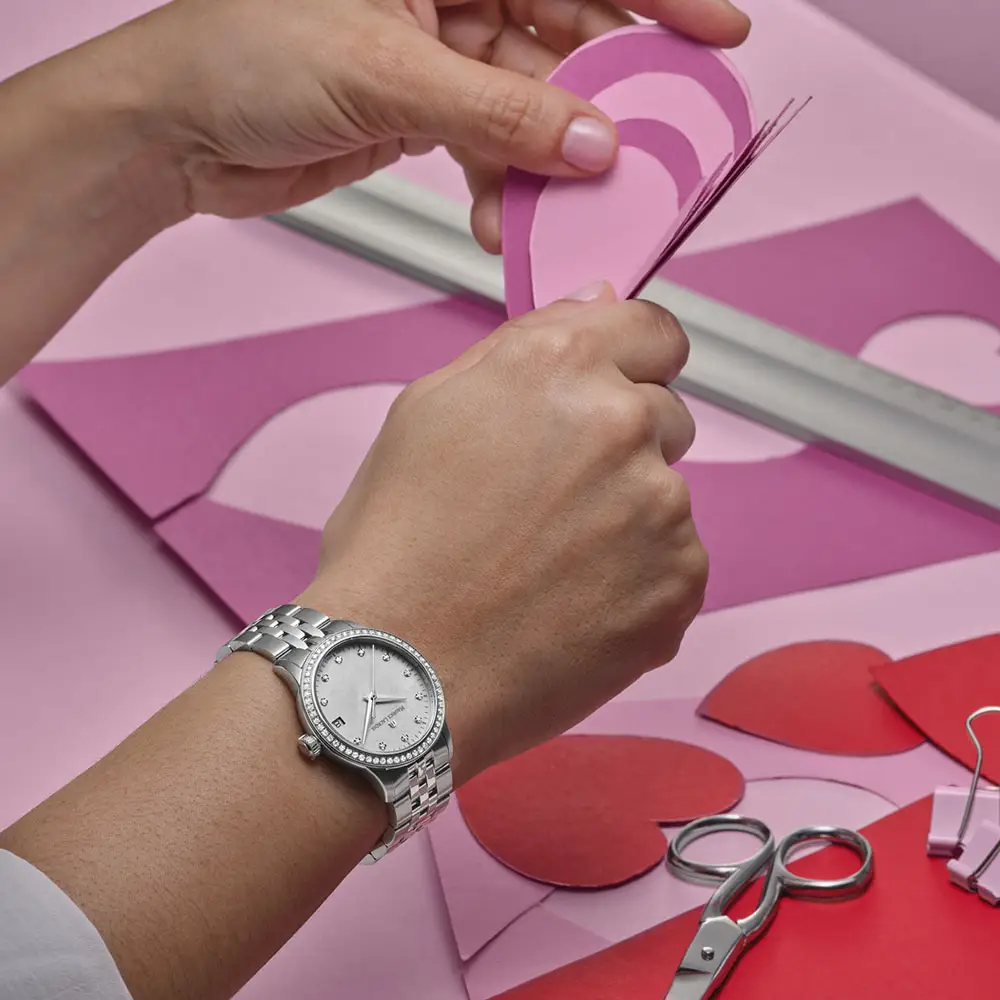 Đồng hồ nữ Maurice Lacroix 1975 Quartz 33 mm (751006-SD502-170-1) kết hợp độ chính xác của đồng hồ Thụy Sĩ với thiết kế thanh lịch vượt thời gian. Vỏ thép không gỉ 33 mm được hoàn thiện với vành bezel đính kim cương, mang lại vẻ ngoài sang trọng và nữ tính. Mặt số xà cừ với các cọc giờ kim cương tạo hiệu ứng ánh sáng tinh tế.