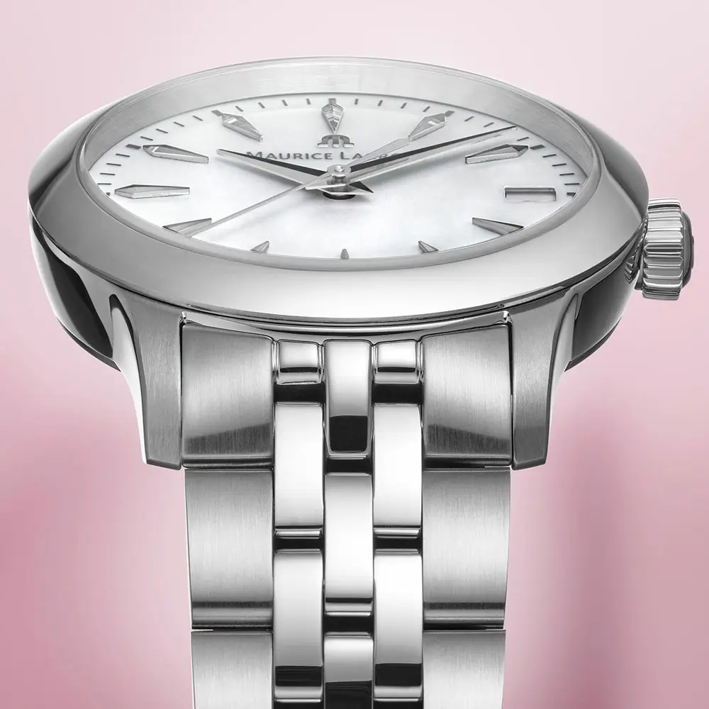 Đồng hồ nữ Maurice Lacroix 1975 Quartz 33 mm (751006-SS002-160-1) kết hợp độ chính xác của đồng hồ Thụy Sĩ với thiết kế thanh lịch vượt thời gian. Vỏ thép không gỉ 33 mm với bề mặt đánh bóng và chải xước mang lại vẻ ngoài tinh tế, phù hợp với cổ tay nữ nhỏ. Đồng hồ có mặt số xà cừ màu trắng với kim và cọc giờ mạ rhodium giúp dễ đọc thời gian.