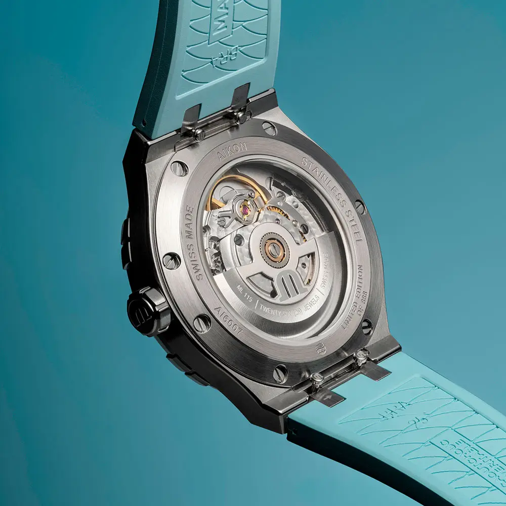 Bên trong là bộ máy cơ tự động ML115 với 38 giờ trữ cót, mang lại độ chính xác mượt mà chuẩn Thụy Sĩ. Với khả năng chống nước 20 ATM (200 m), đồng hồ phù hợp cho cả bơi lội và thể thao. Dây thép liền khối với khóa gập hoàn thiện vẻ sang trọng và tràn đầy sức sống của Aikon Summer Edition.