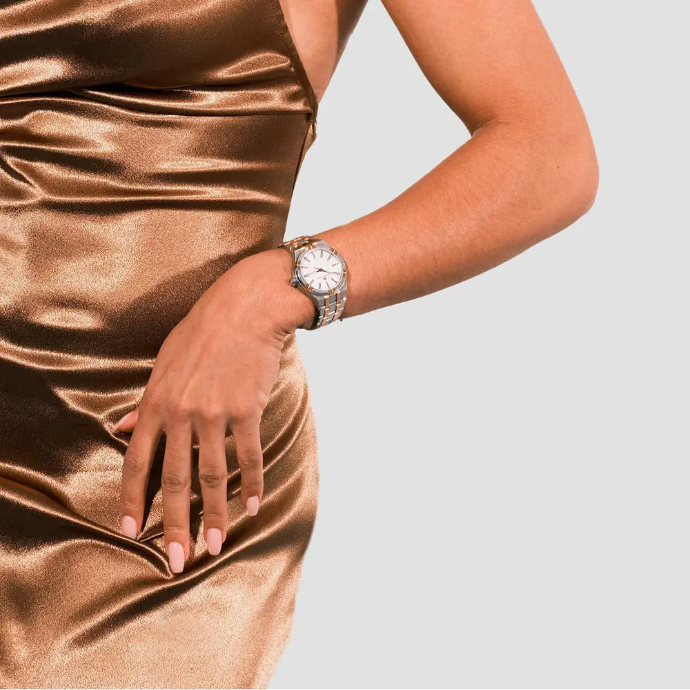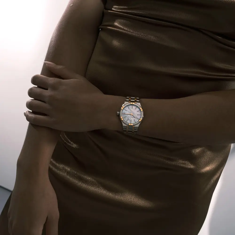 Bên trong là bộ máy quartz Ronda 515 của Thụy Sĩ, nổi tiếng với độ chính xác và bền bỉ. Đồng hồ được hoàn thiện với dây thép – vàng hồng hai tông màu, khóa gập kiểu butterfly và hệ thống “Easy Change” giúp thay dây dễ dàng. Với khả năng chống nước 100 m (10 ATM), Aikon Quartz Date là lựa chọn hoàn hảo cho phụ nữ yêu thích sự sang trọng hiện đại, tính tiện dụng và vẻ đẹp vượt thời gian.
