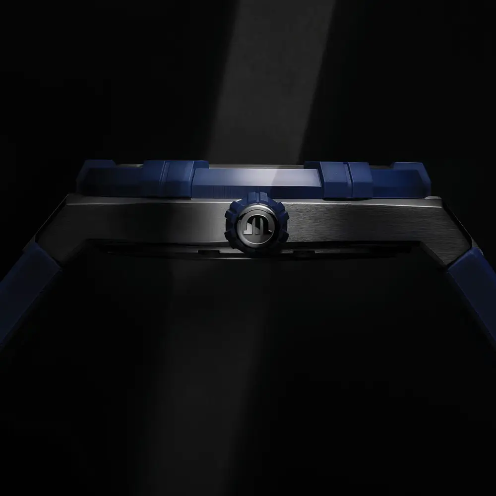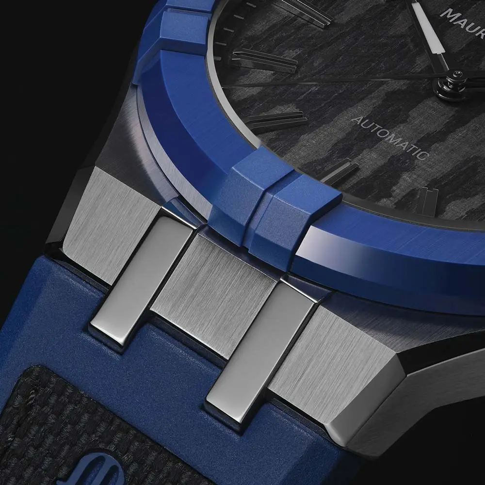 Mặt số đen họa tiết sợi carbon nổi bật với cọc số và kim mạ rhodium phủ dạ quang. Lịch ngày ở vị trí 3 giờ mang lại tính tiện ích hàng ngày.