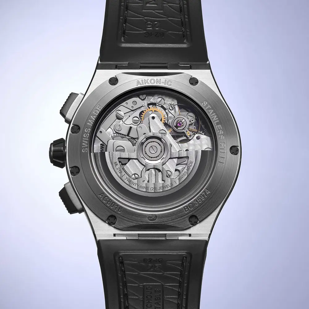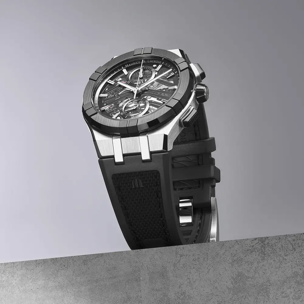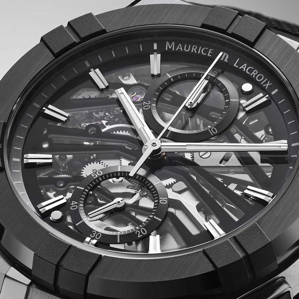 Maurice Lacroix AikonIc Automatic Chronograph Skeleton (ref. AC8018-SSL20-030-2) là mẫu đồng hồ chronograph thể thao hiện đại với thiết kế skeleton nổi bật. Vỏ 43 mm bằng thép không gỉ 316L kết hợp vành bezel gốm chống trầy xước cao. Bezel 6 cạnh đặc trưng tạo dấu ấn riêng. Trang bị kính sapphire chống phản xạ hai mặt, núm vặn vít và khả năng chống nước 100 m (10 ATM).