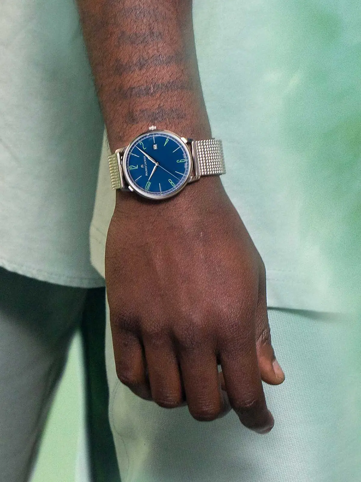 Vỏ thép không gỉ 40 mm ôm lấy mặt số xanh lam hiệu ứng tia mặt trời, phản chiếu ánh sáng tinh tế và cuốn hút. Lịch ngày tại vị trí 3 giờ, cùng kim và cọc số màu bạc, tạo nên vẻ thanh lịch hài hòa. Kính sapphire chống phản chiếu đảm bảo khả năng hiển thị hoàn hảo.