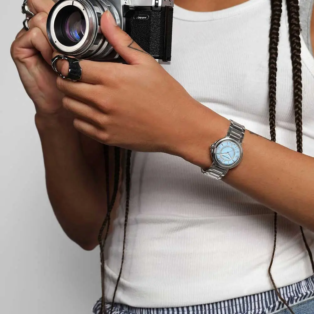 Mặt số xanh nhạt được trang trí bằng 46 viên kim cương lấp lánh cùng các chữ số Ả Rập tinh xảo, tạo nên vẻ đẹp hiện đại và quý phái. Kính sapphire chống phản chiếu bảo vệ mặt số và tôn lên ánh sáng rực rỡ của kim cương.