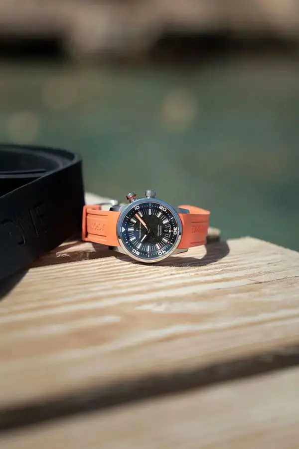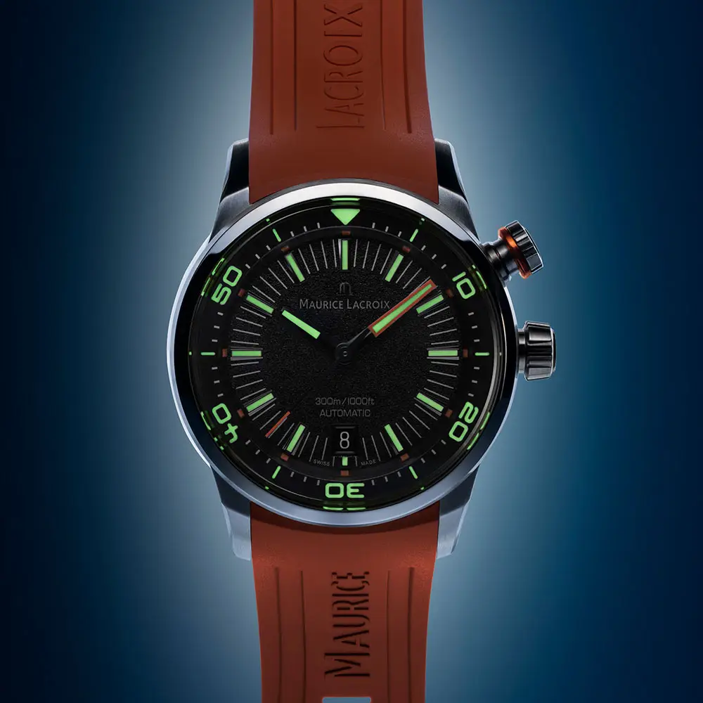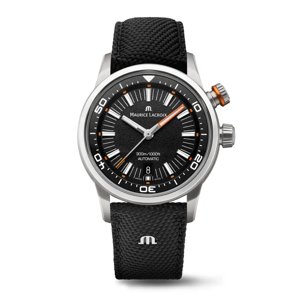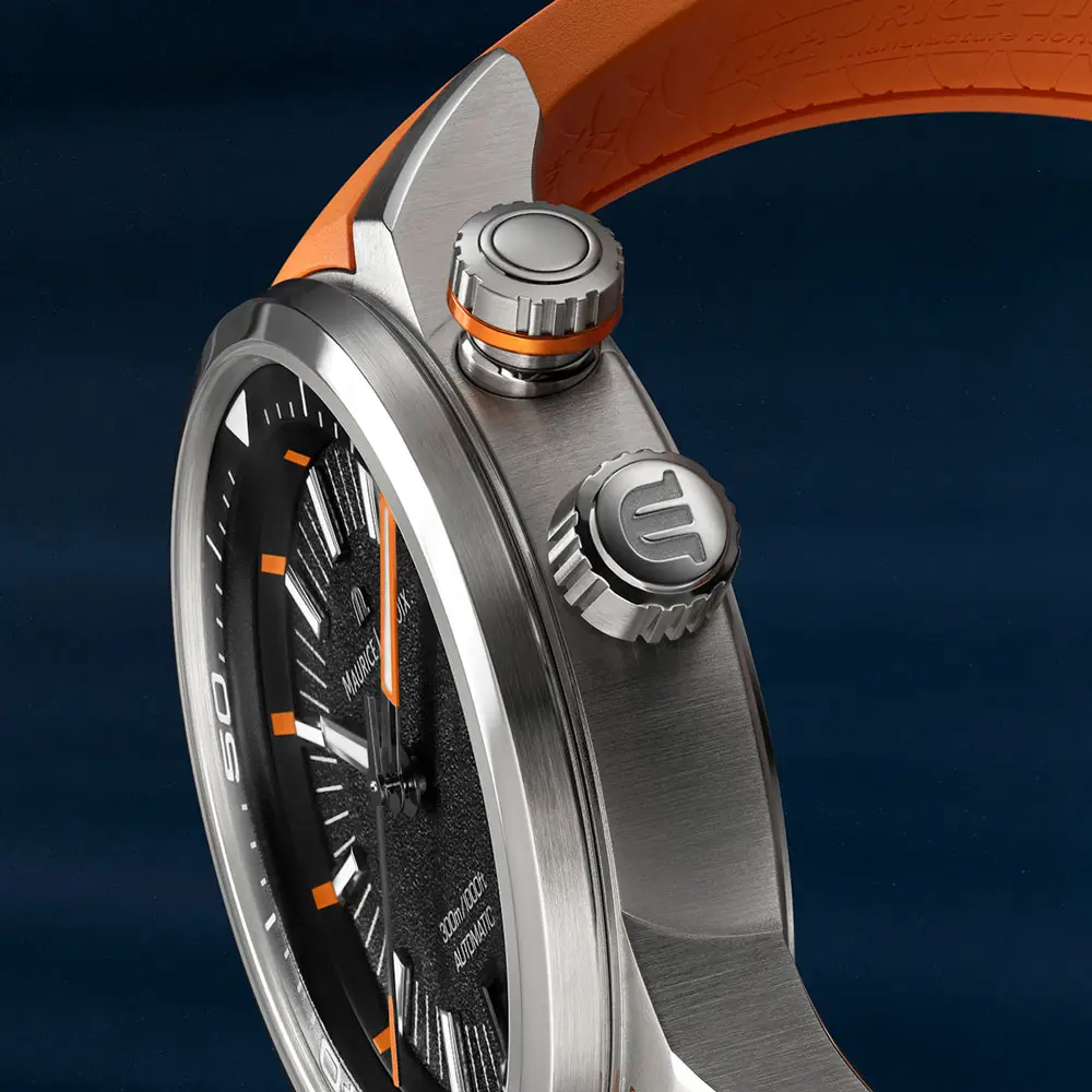 Vỏ thép không gỉ 42 mm được hoàn thiện xen kẽ giữa đánh bóng và chải xước, mang lại vẻ mạnh mẽ và tinh tế. Mặt số đen với kim và cọc số phủ dạ quang Super-LumiNova giúp hiển thị rõ ràng dưới nước. Kính sapphire chống phản chiếu hai mặt bảo vệ mặt số, trong khi vành bezel xoay trong hỗ trợ đo thời gian lặn chính xác.