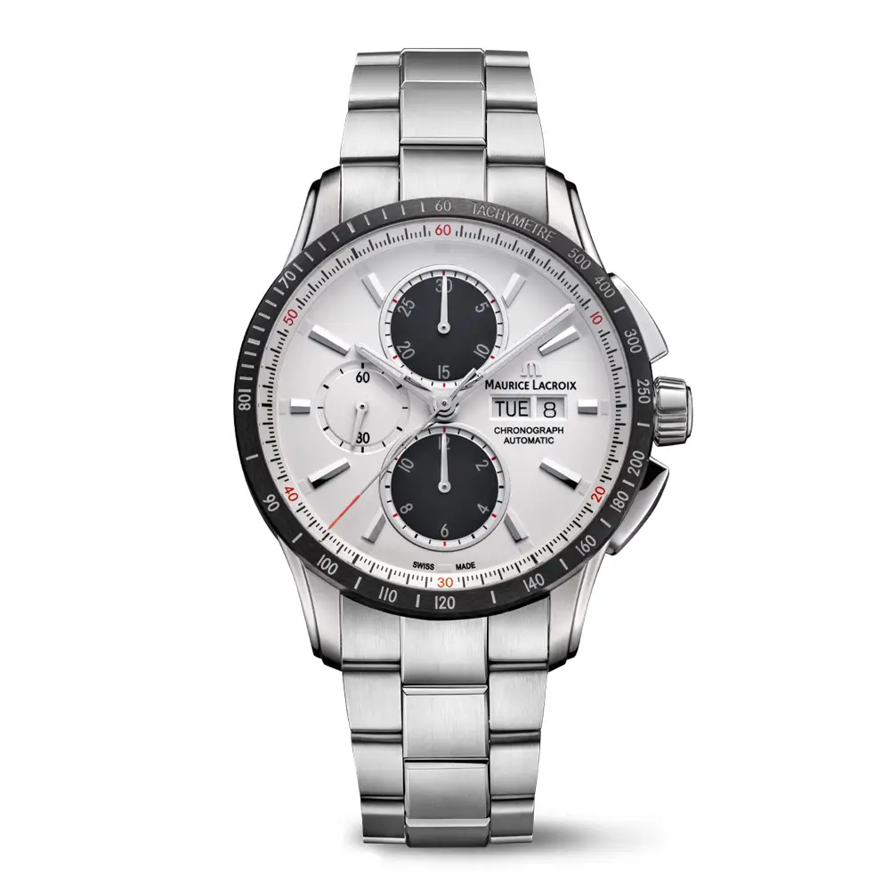 Đồng hồ Maurice Lacroix Pontos S Chronograph (ref. PT6038-SSL22-130-1) là sự kết hợp hoàn hảo giữa phong cách thể thao sang trọng và độ chính xác Thụy Sĩ. Vỏ thép không gỉ 43 mm đi kèm vành bezel bằng gốm, vừa bền chắc vừa mang vẻ đẹp hiện đại.
