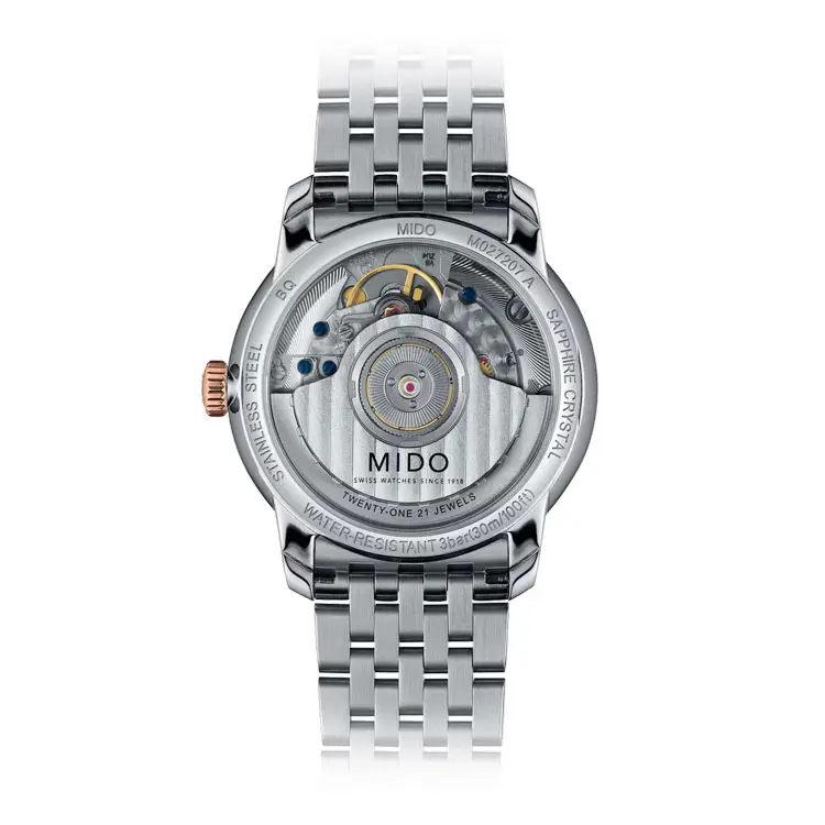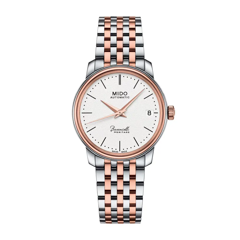 Đồng hồ Mido Baroncelli Heritage Lady là mẫu đồng hồ nữ thanh lịch và vượt thời gian, kết hợp sự chính xác Thụy Sĩ với tính thẩm mỹ tinh tế. Vỏ tròn đường kính 33 mm được làm từ thép không gỉ chất lượng cao, kết hợp với các chi tiết mạ vàng hồng, bao gồm cả vành bezel, mang lại vẻ ngoài hiện đại và sang trọng.