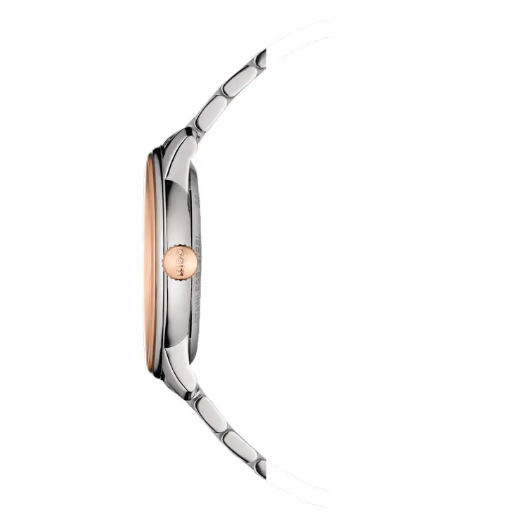 Dây đeo thép không gỉ hai tông màu với các chi tiết mạ vàng hồng và khóa gập tiện lợi làm nổi bật nét sang trọng và đảm bảo sự thoải mái khi đeo. Với khả năng chống nước 3 ATM (30 mét), đồng hồ phù hợp để đeo hàng ngày trong điều kiện thông thường.