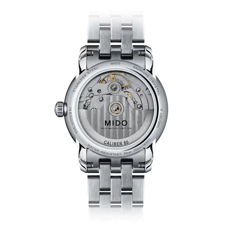 Đồng hồ Mido Baroncelli Diamonds là sự kết hợp hoàn hảo giữa nét thanh lịch, chi tiết tinh tế và truyền thống chế tác đồng hồ Thụy Sĩ. Vỏ tròn cổ điển đường kính 33 mm được làm từ thép không gỉ chất lượng cao và được bảo vệ bởi mặt kính sapphire bền bỉ, đảm bảo khả năng bảo vệ và dễ đọc.