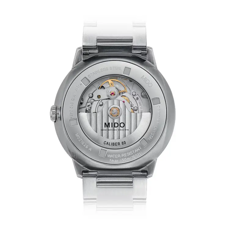 Bộ máy tự động Mido Caliber 80 Big Date mang lại dự trữ năng lượng 80 giờ và dây tóc silicon giúp tăng độ chính xác và khả năng chống từ. Dây thép khóa gập đôi mang lại cảm giác thoải mái và phong thái sang trọng. Mido Commander Big Date M021.626.11.091.00 là lựa chọn hoàn hảo cho quý ông hiện đại yêu thích sự tinh tế và bền bỉ.
