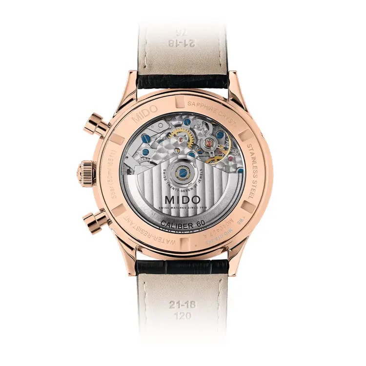 Đồng hồ Mido Multifort Patrimony Chronograph là sự kết hợp thanh lịch giữa phong cách cổ điển, chi tiết tinh tế và chất lượng chế tác đồng hồ Thụy Sĩ. Vỏ tròn đường kính 42 mm được làm từ thép phủ PVD vàng hồng, mang đến vẻ ngoài sang trọng và tinh tế. Mặt kính sapphire bền bỉ đảm bảo bảo vệ hoàn hảo và khả năng đọc rõ ràng.