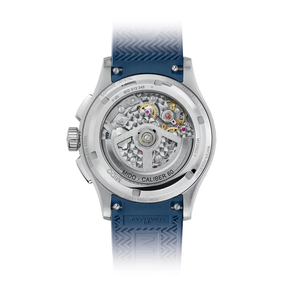 Bên trong là bộ máy cơ tự động Mido Automatic ETA đáng tin cậy với mức dự trữ năng lượng khoảng 60 giờ, mang lại độ bền lâu dài và độ chính xác cao.
