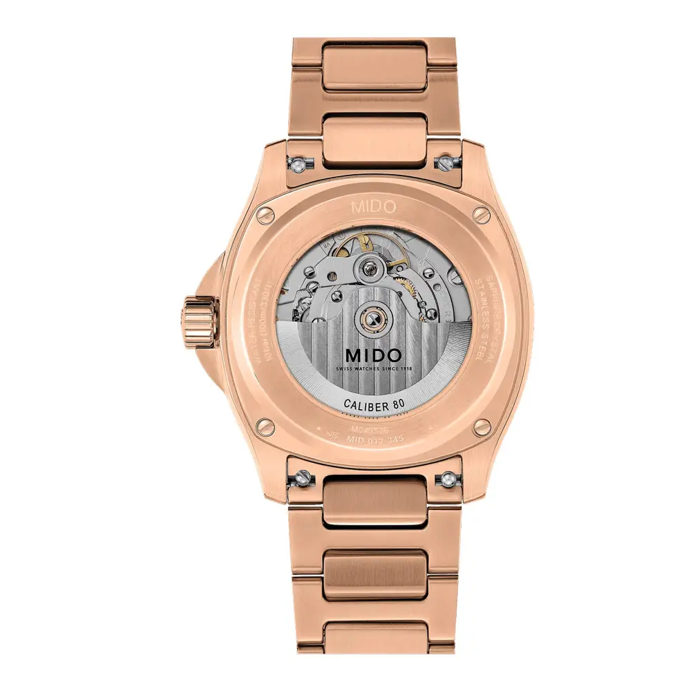 Bên trong là bộ máy cơ tự động Mido Caliber 80 với trữ cót lên đến 80 giờ, đảm bảo hiệu suất lâu dài. Dây tóc Nivachron giúp tăng khả năng chống từ và chống sốc. Điểm nổi bật là lịch ngày cỡ lớn (Big Date) tại vị trí 12 giờ, giúp dễ quan sát. Nắp lưng trong suốt cho phép nhìn thấy bộ máy hoạt động.
