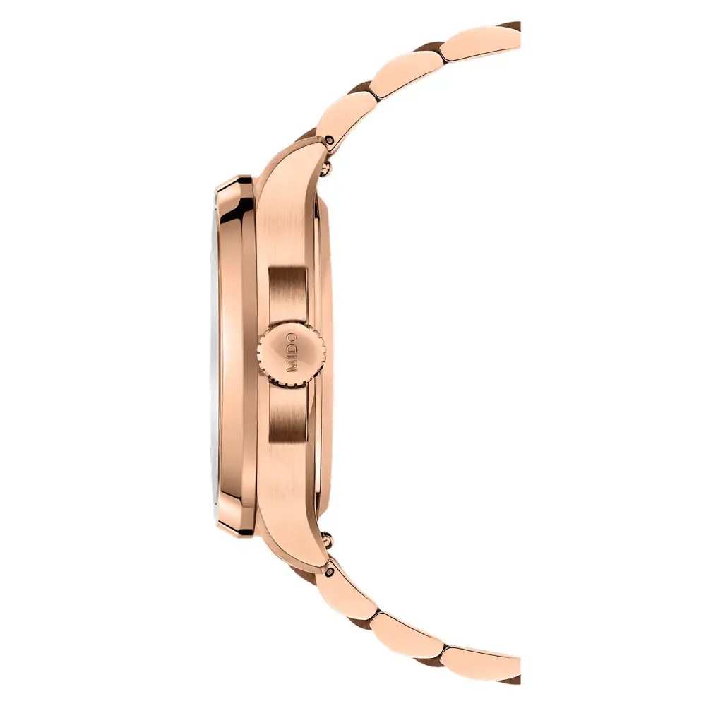 Đồng hồ Mido Multifort TV Big Date M049.526.33.041.00 nổi bật với thiết kế retro độc đáo lấy cảm hứng từ màn hình TV thập niên 70. Vỏ dạng TV (40 × 39,2 mm) làm từ thép không gỉ 316L với lớp phủ PVD màu vàng hồng mang lại vẻ ngoài hiện đại và ấn tượng. Kính sapphire chống trầy xước với lớp phủ chống phản chiếu hai mặt giúp hiển thị rõ ràng, trong khi khả năng chống nước 100 m (10 bar) phù hợp cho sử dụng hằng ngày.