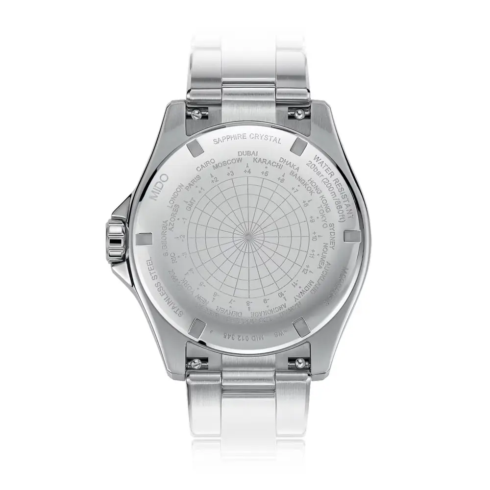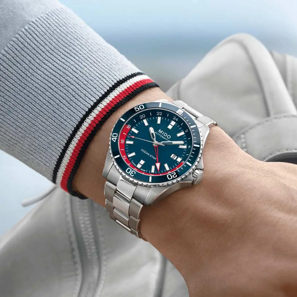 Mido Ocean Star GMT M026.629.11.041.00 là người bạn đồng hành đáng tin cậy cho cả người yêu biển lẫn khách du lịch. Vỏ thép không gỉ 44 mm, vòng bezel gốm xanh xoay và mặt kính sapphire phủ chống lóa đảm bảo độ bền và khả năng hiển thị tuyệt vời. Khả năng chống nước tới 200 mét khẳng định chất lượng đồng hồ lặn.