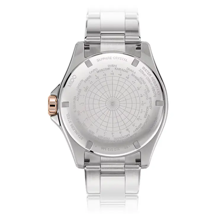 Bộ máy tự động Mido Caliber 80 với dự trữ năng lượng 80 giờ, khả năng chống nước 200 m (20 ATM) và dây kim loại hai tông màu khóa gập mang lại sự bền bỉ và đẳng cấp. Mido Ocean Star GMT là người bạn đồng hành lý tưởng cho mọi hành trình.