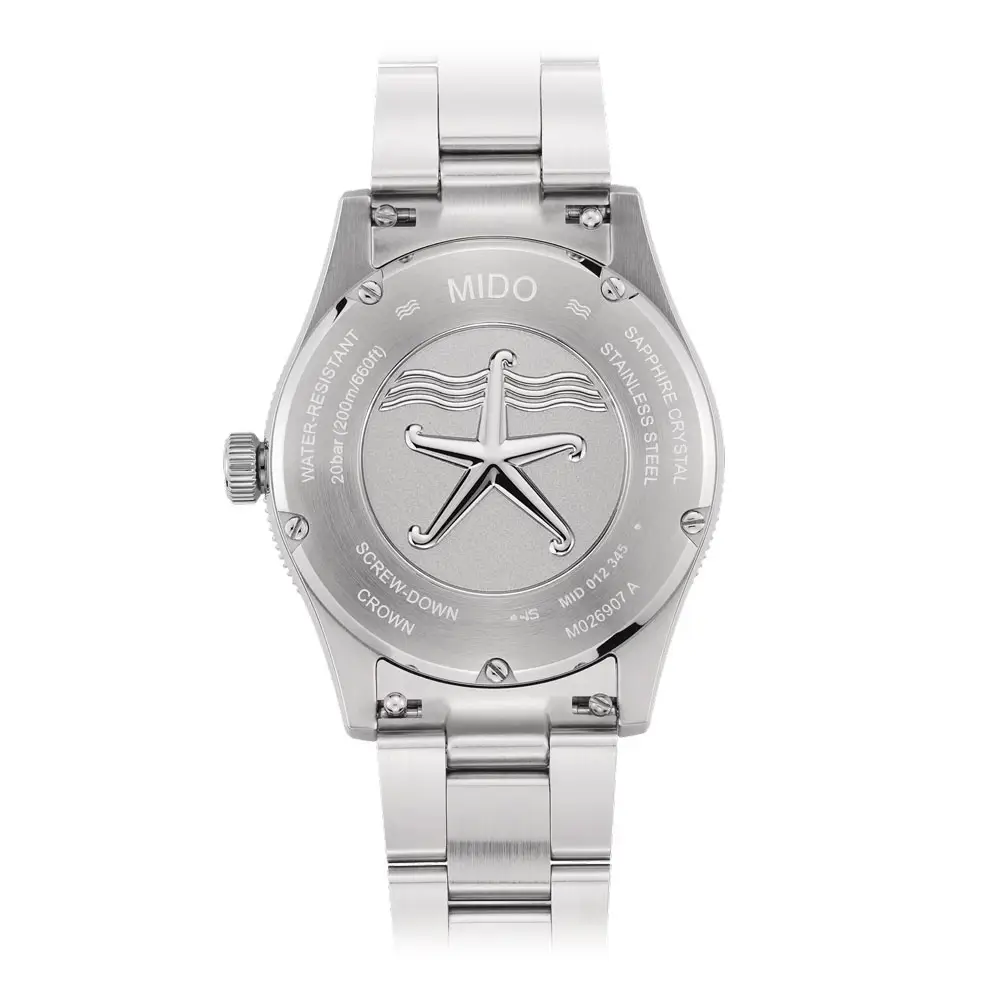 Mẫu đồng hồ này được trang bị bộ máy tự động Caliber 72 (phát triển bởi ETA A31.111) với dự trữ năng lượng lên đến 72 giờ và lò xo chống từ Nivachron™, đảm bảo độ chính xác và độ tin cậy lâu dài. Khả năng chống thấm nước đến 200 m cùng với nút vặn và nắp sau có chạm khắc hình sao biển phản ánh di sản và chuyên môn của Mido trong lĩnh vực đồng hồ lặn.