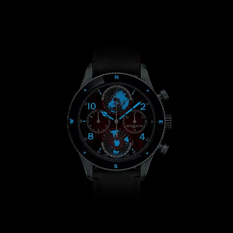 Vỏ titanium 44 mm vừa nhẹ vừa bền, kết hợp với vành bezel gốm xoay hai chiều có khắc ký hiệu la bàn. Mặt số đỏ với hoa văn “băng nứt” gợi hình ảnh đỉnh núi phủ tuyết, tạo chiều sâu độc đáo. Dưới lớp kính sapphire chống xước là hai bán cầu xoay hiển thị giờ thế giới, cùng chức năng chronograph thể thao mạnh mẽ.