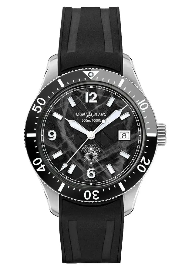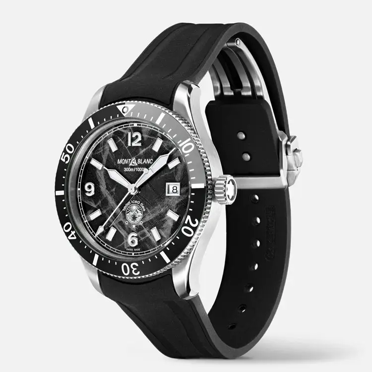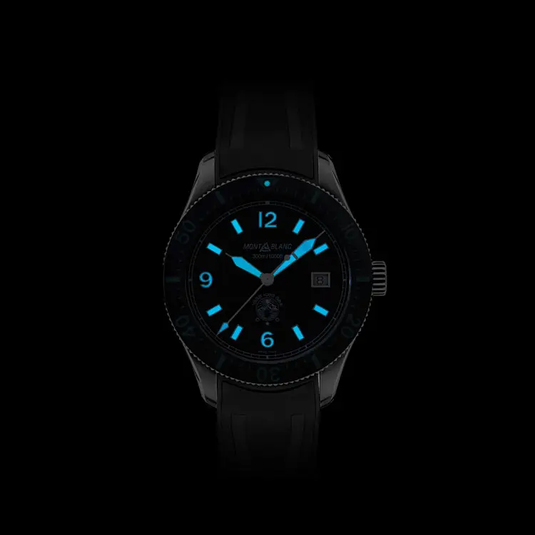 Mặt số màu đen với họa tiết nứt băng độc đáo được trang bị lịch ngày và chi tiết dạ quang, giúp dễ đọc ngay cả dưới nước. Bên trong là bộ máy tự động Montblanc MB 24.17, hoạt động chính xác mà không cần lên dây thủ công.