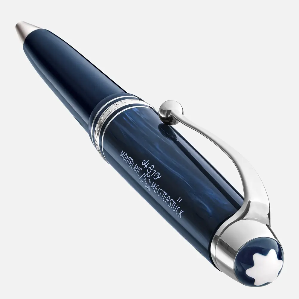 Thân và nắp bút được chế tác từ nhựa quý màu xanh (blue precious resin), mang sắc độ sâu và sang trọng. Kẹp bút mạ bạch kim (platinum-coated clip) tạo điểm nhấn tinh tế, trong khi kích thước 141,1 × 13,8 mm mang lại cảm giác cầm nắm hoàn hảo.