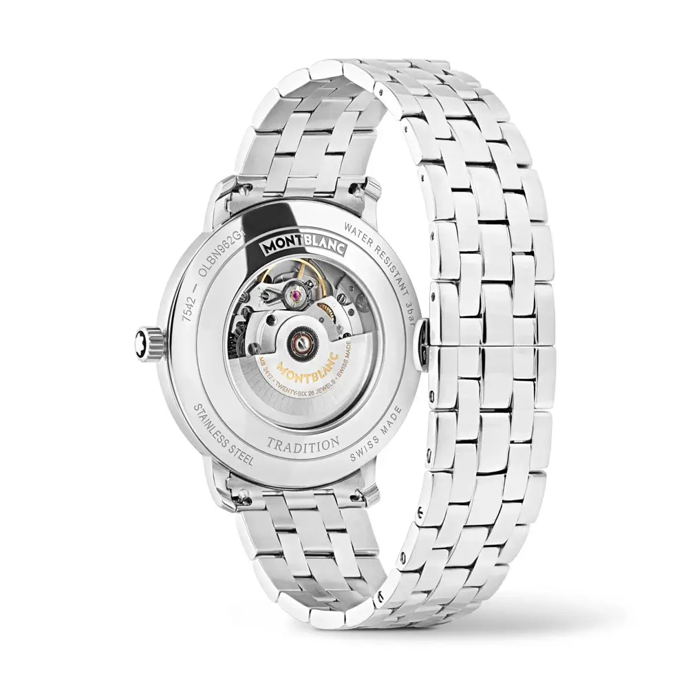 Đồng hồ đi kèm dây đeo thép không gỉ với khóa gập, mang lại sự thoải mái khi đeo. Nhờ sự kết hợp giữa tay nghề chế tác Thụy Sĩ, vật liệu cao cấp và thiết kế vượt thời gian, Montblanc Tradition Automatic Date là lựa chọn hoàn hảo cho cả sử dụng hàng ngày và các dịp trang trọng.