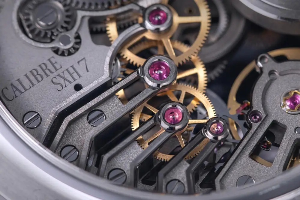 Trái tim là bộ máy SXH7 tự động, tần số 28,800 vph (4 Hz), dự trữ năng lượng 60 giờ. Cơ cấu bên trong với rotor và cầu máy trang trí thủ công lộ rõ qua mặt số skeleton tinh xảo.