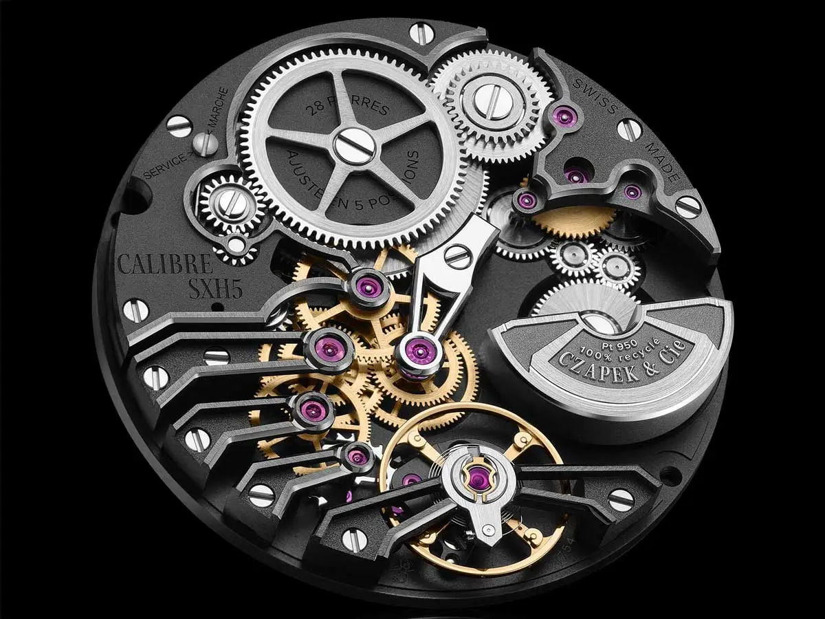 Bên trong là bộ máy SXH5 tự động, dự trữ năng lượng lên đến 60 giờ. Bộ máy được hoàn thiện tinh xảo, có thể quan sát qua mặt đáy trong suốt, là một kiệt tác công nghệ của ngành chế tác đồng hồ hiện đại.