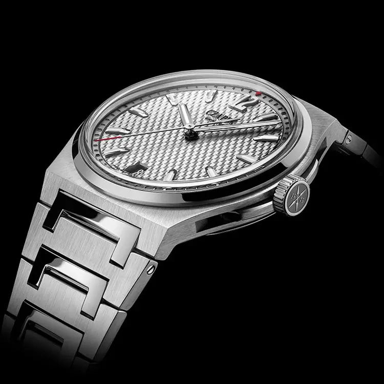 Vỏ tròn bằng thép không gỉ 40,5 mm liền mạch với dây đeo thép màu bạc, mang lại sự thoải mái và vẻ ngoài hiện đại. Đồng hồ có kính sapphire và khả năng chống nước cao 12 ATM (120 mét) – phù hợp cho những cuộc phiêu lưu hàng ngày và các hoạt động dưới nước.