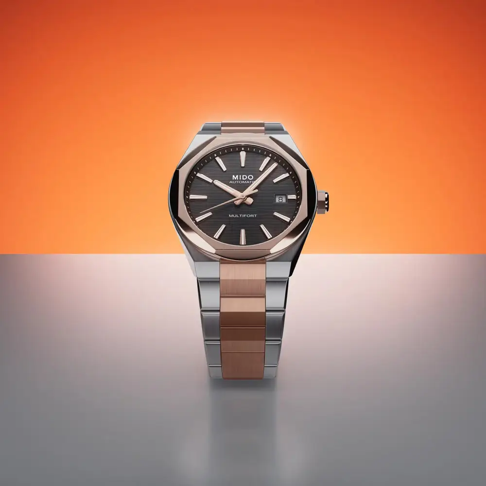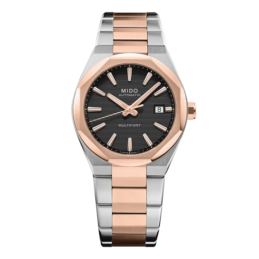Mido Multifort 8 One Crown gây ấn tượng với thiết kế hiện đại mang cảm hứng kiến trúc, nổi bật cùng vành bezel bát giác và dây đeo thép tích hợp với lớp phủ PVD tông vàng hồng. Mặt số đen với cấu trúc tinh tế tạo chiều sâu thị giác, trong khi kim và cọc số phủ dạ quang bảo đảm khả năng hiển thị rõ ràng. Sự cân bằng giữa phong cách thể thao và vẻ thanh lịch giúp mẫu đồng hồ trở thành lựa chọn linh hoạt cho mọi dịp.