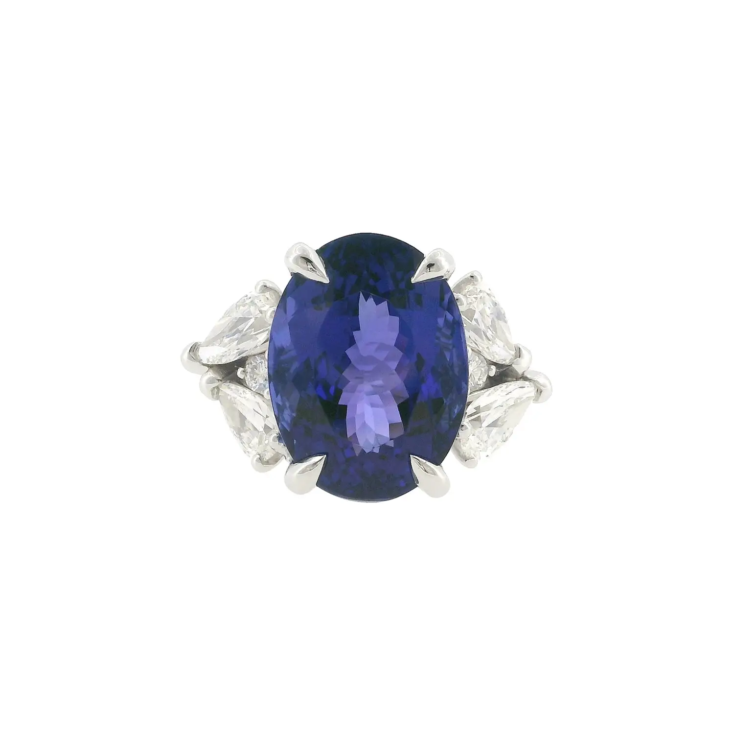 Chiếc nhẫn vàng trắng cao cấp này gây ấn tượng mạnh với viên tanzanite tự nhiên 13,35 ct nổi bật ở trung tâm. Viên đá sở hữu sắc xanh tím đậm cùng hiệu ứng ánh sáng cuốn hút thay đổi theo từng góc nhìn. Tanzanite trung tâm được nạm tinh xảo nhằm tôn lên tối đa kích thước, độ tinh khiết và tông màu độc đáo của nó.