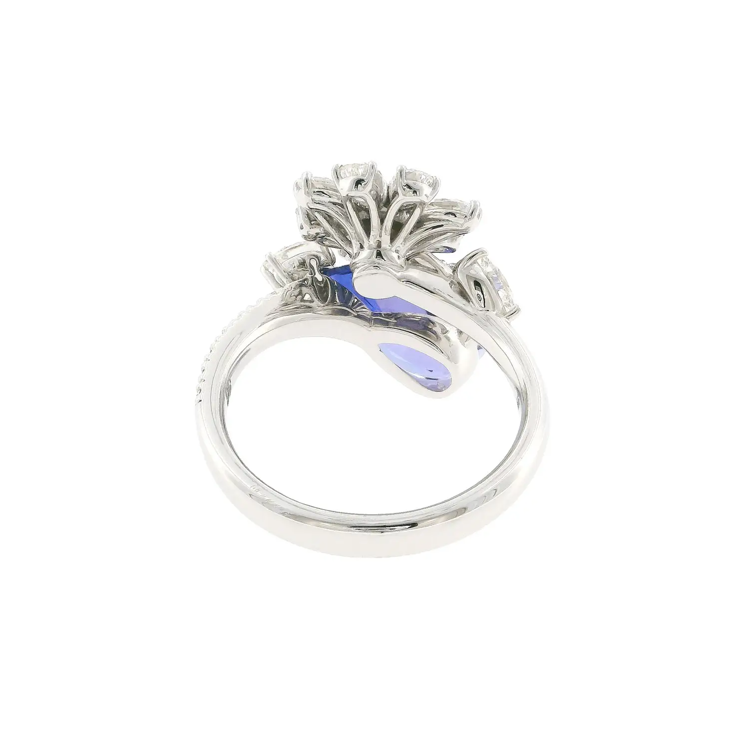 Bao quanh tanzanite là các viên kim cương có tổng trọng lượng 1,39 ct đạt tiêu chuẩn màu G / độ tinh khiết VS, nổi bật với độ tinh khiết rất tốt và màu gần như không màu. Ánh lấp lánh của kim cương tạo nên sự tương phản tuyệt đẹp với sắc màu sâu của viên chủ, mang lại vẻ sang trọng và tinh tế. Thiết kế cân đối giúp chiếc nhẫn luôn thanh lịch ở mọi góc nhìn.