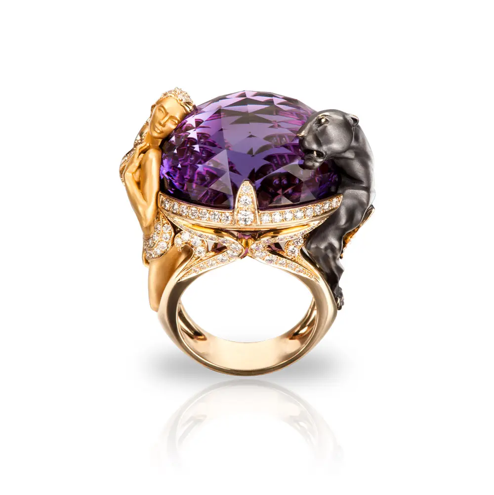 Nhẫn được đính 147 viên kim cương trắng tổng 1,41 ct, tạo hiệu ứng pavé lấp lánh. Trung tâm là đá thạch anh tím (amethyst) 15,16 ct, mang lại vẻ đẹp nổi bật và sang trọng.