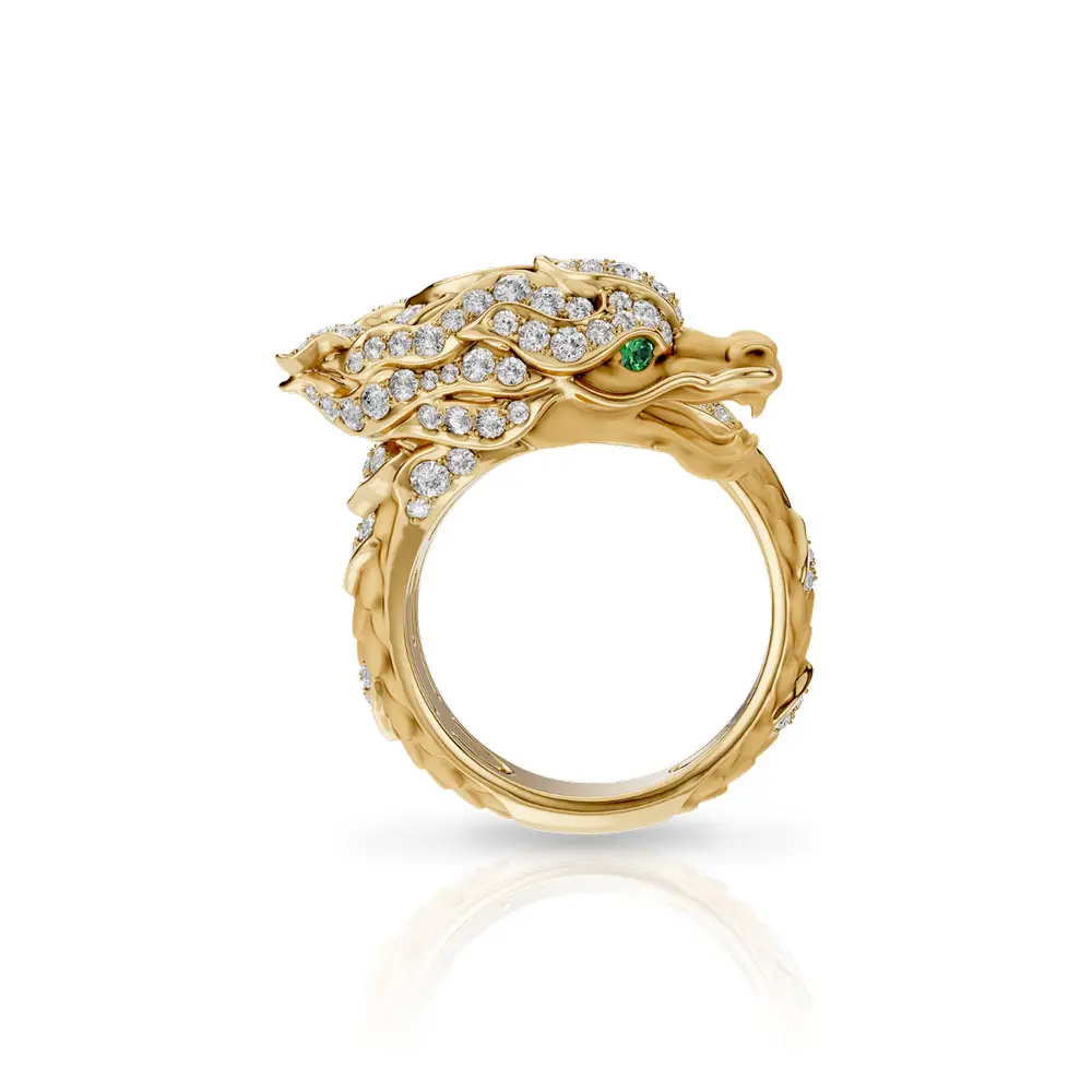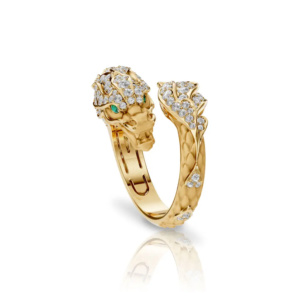Thân nhẫn được trang trí bằng 125 viên kim cương lấp lánh với tổng trọng lượng 1.44 carat, tôn lên thiết kế điêu khắc và chi tiết tinh xảo của từng vảy rồng. Những viên kim cương xanh nặng 0.06 carat, được đính như đôi mắt rồng, mang đến cho món trang sức vẻ đẹp cuốn hút đầy năng lượng và sức sống.