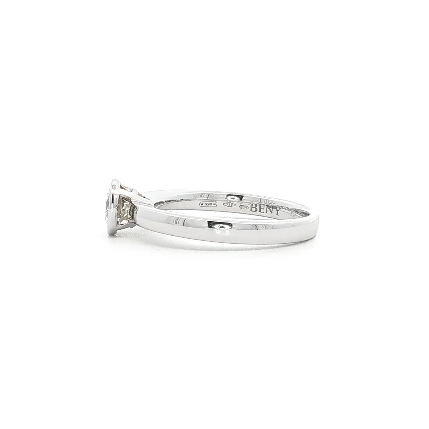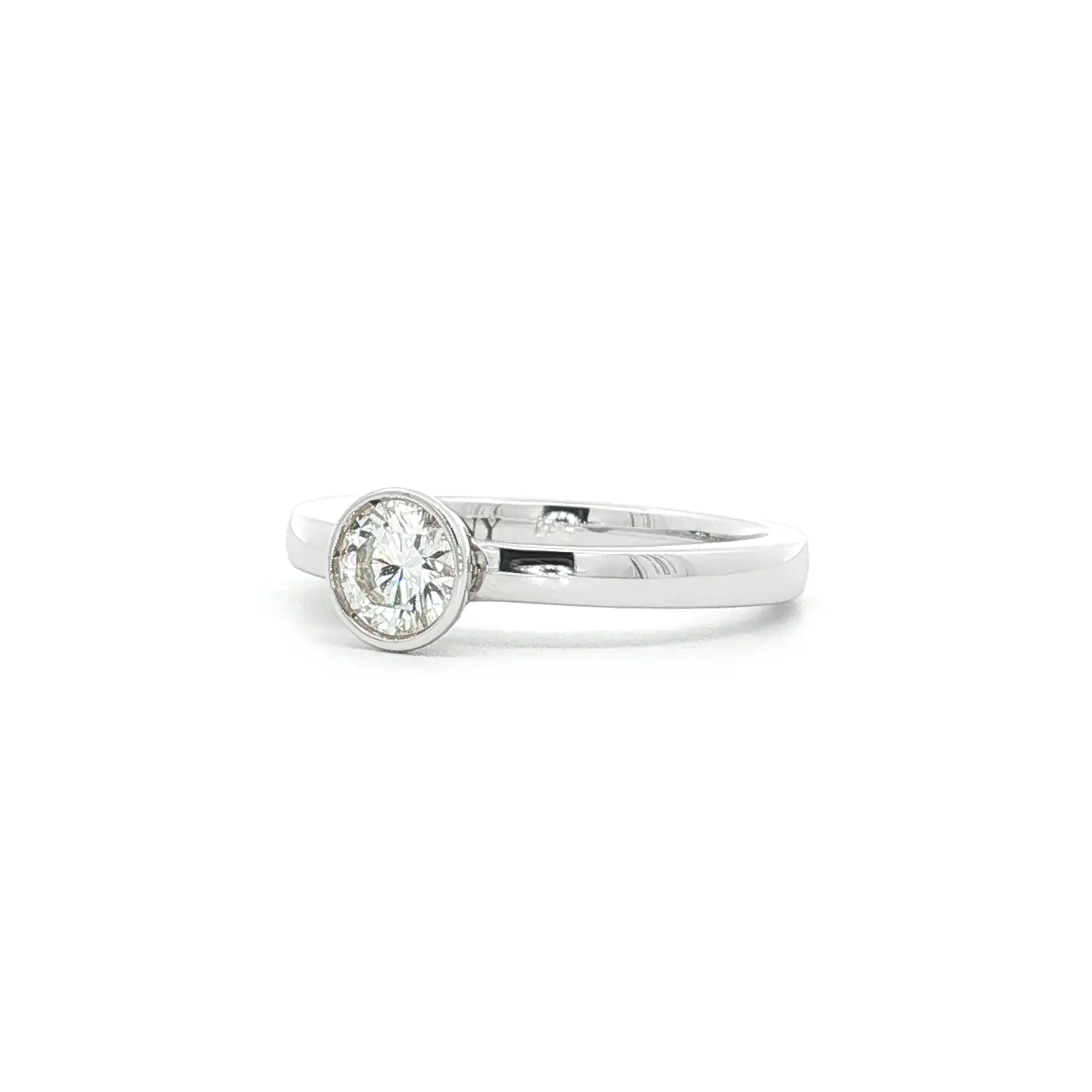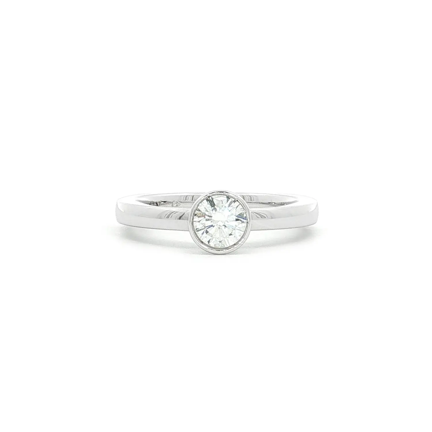 Chiếc nhẫn đính hôn vàng trắng này được đính viên kim cương cắt tròn 0,52 carat, thể hiện vẻ đẹp tinh tế và sang trọng vượt thời gian. Viên kim cương được gắn trong khung trơn nhẵn, giúp tôn lên ánh sáng rực rỡ tự nhiên và mang đến phong cách tối giản nhưng đầy cuốn hút.
