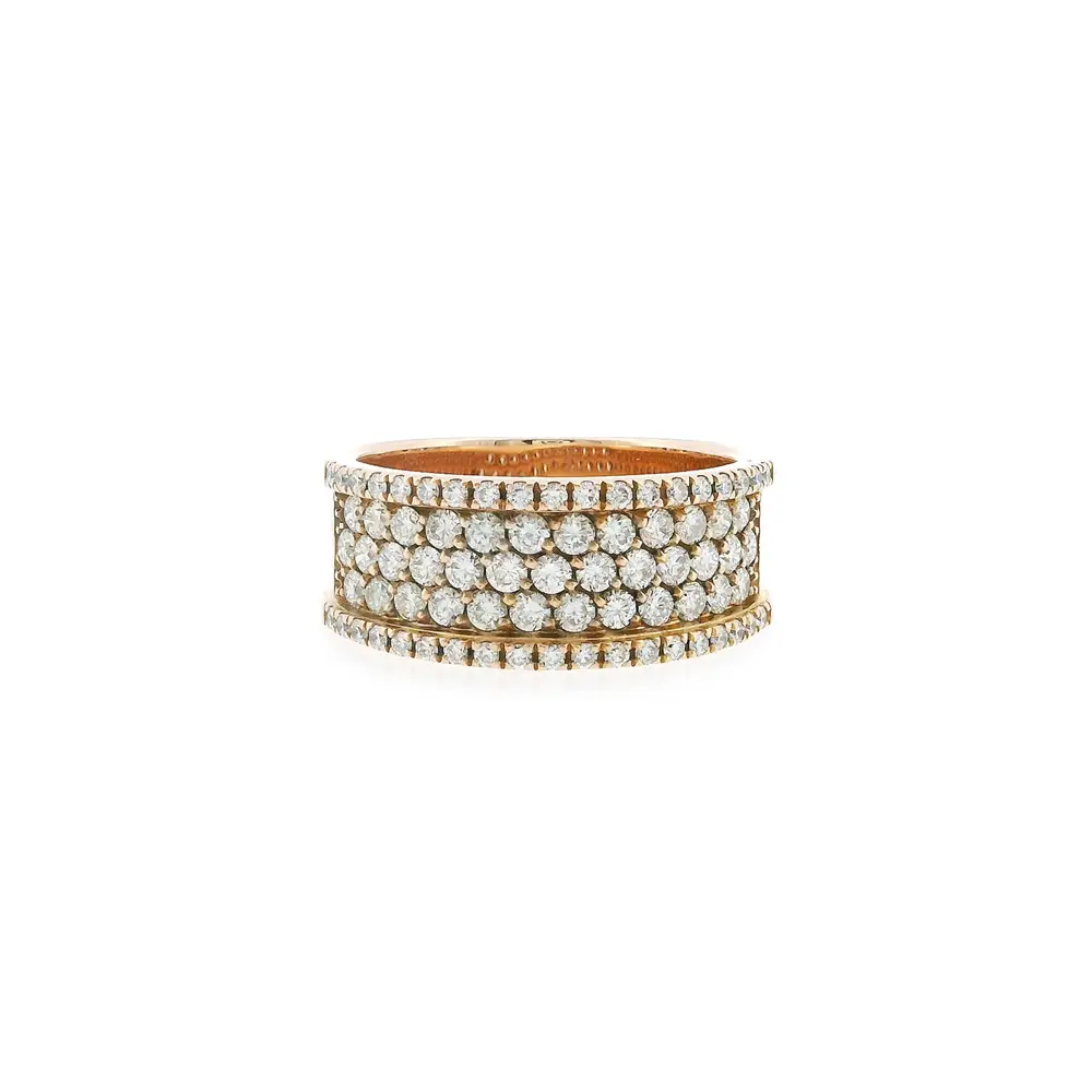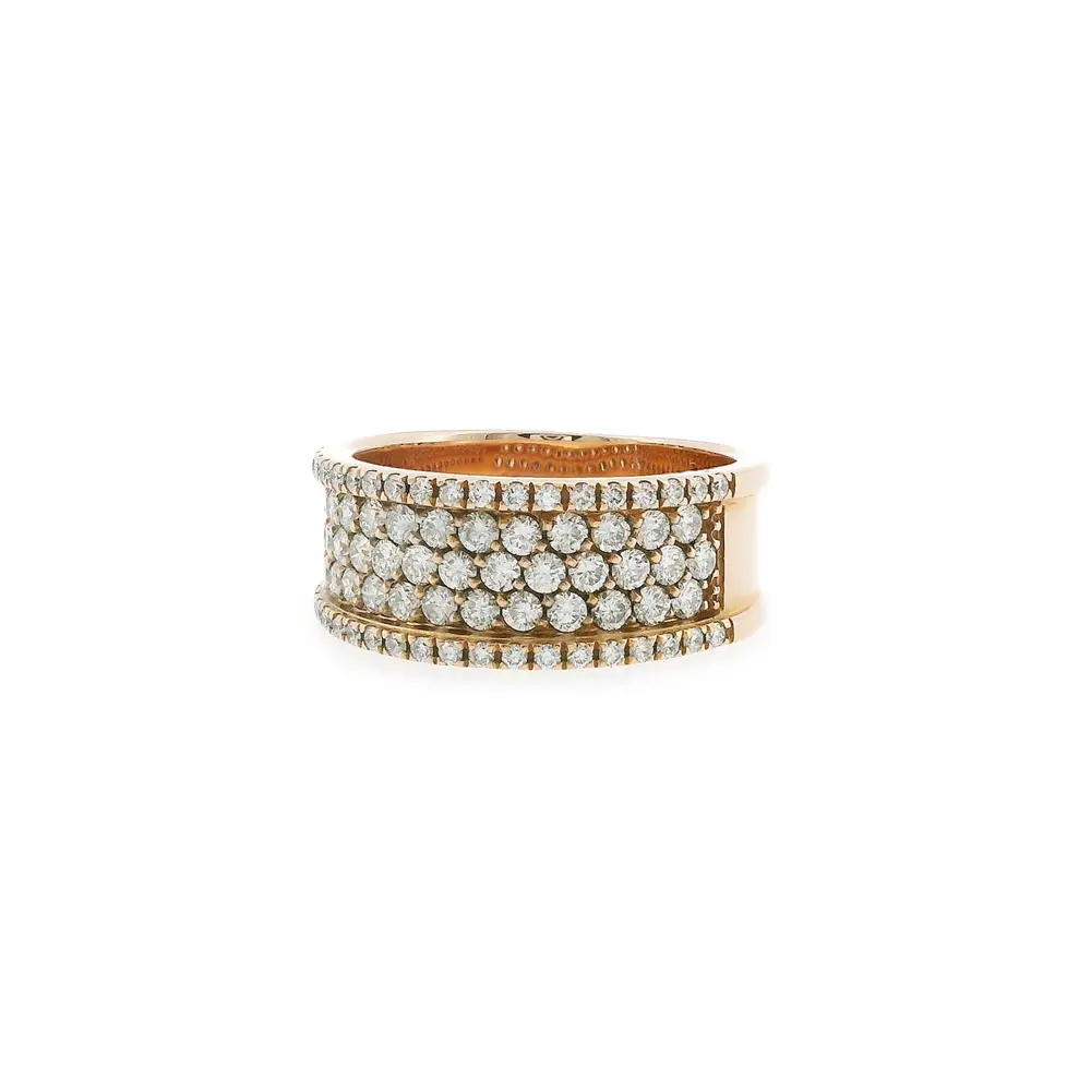 Chiếc nhẫn cao cấp bằng vàng hồng này gây ấn tượng với thiết kế bản rộng, thể hiện sự sang trọng và cá tính mạnh mẽ. Bề mặt được nạm kim cương cắt brilliant với tổng trọng lượng 0,90 ct, sắp xếp đều đặn để tạo nên hiệu ứng lấp lánh nổi bật.