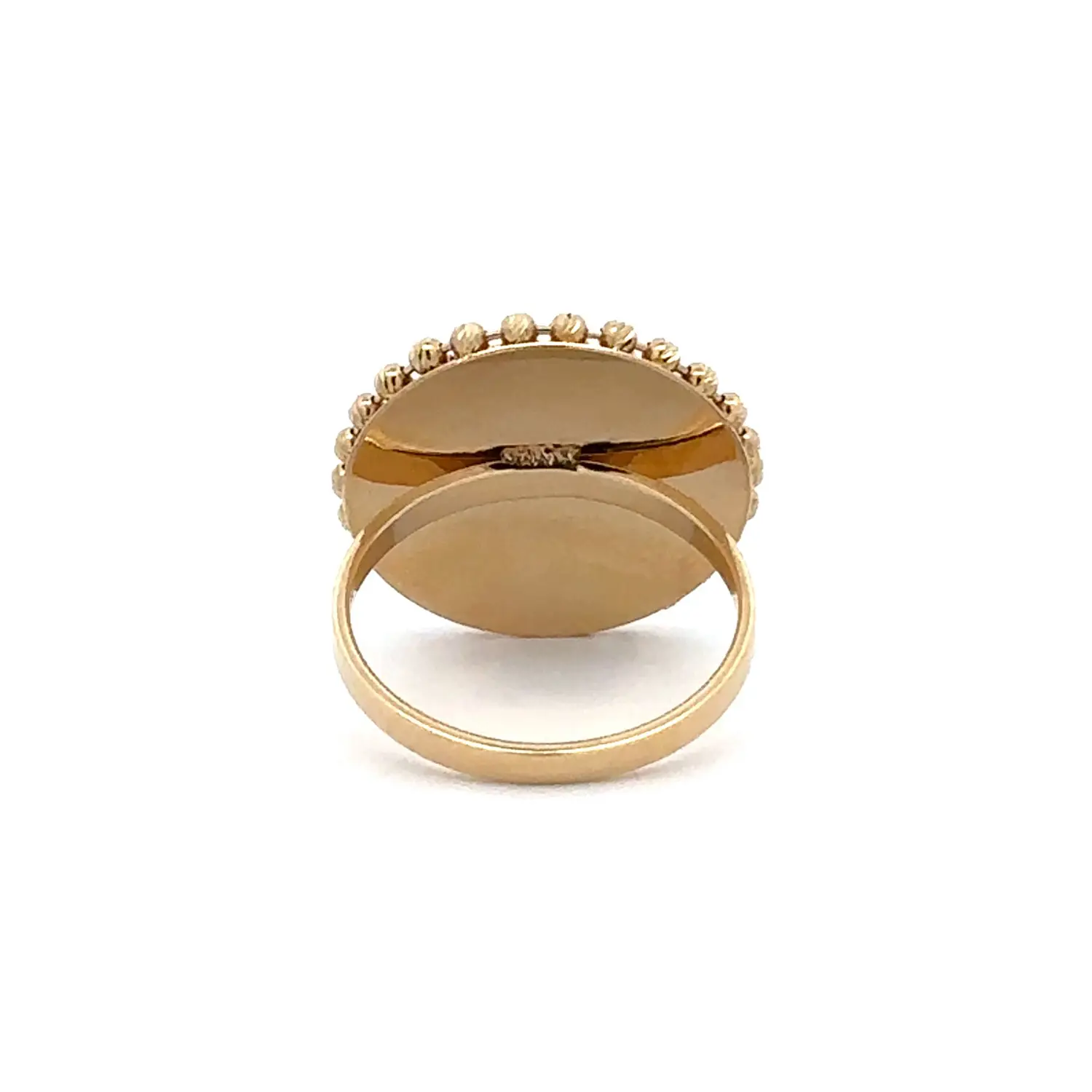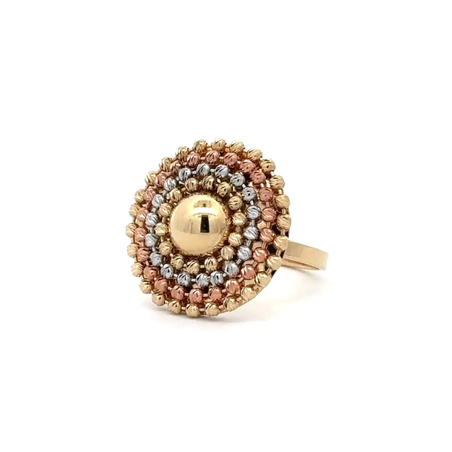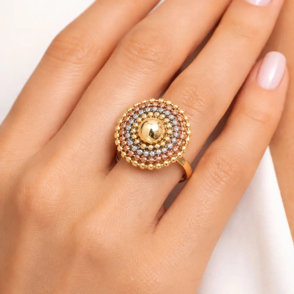 Chiếc nhẫn ấn tượng này kết hợp tinh xảo vàng vàng, vàng trắng và vàng hồng 14K, tạo thành họa tiết tròn nổi đầy sắc sảo. Đỉnh nhẫn nhẵn được bao quanh bởi nhiều vòng hạt nhỏ, tạo hiệu ứng ánh sáng và chiều sâu tuyệt đẹp. Thiết kế mang dáng vẻ như một bức tranh khảm tinh tế, nổi bật ngay khi đeo lên tay.