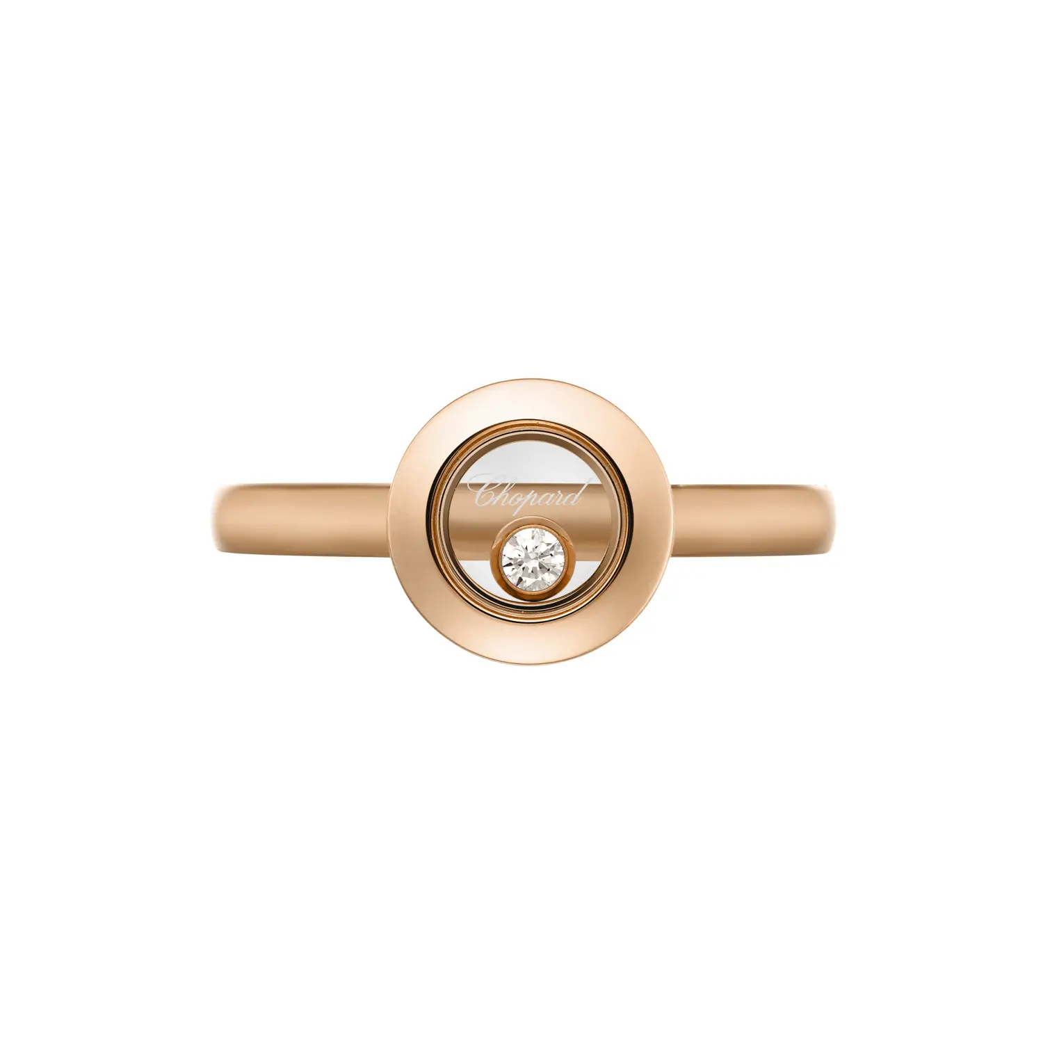 Chiếc nhẫn Chopard Happy Diamonds 82A017-5116 thể hiện vẻ đẹp của ánh sáng và chuyển động – tinh thần đặc trưng của bộ sưu tập biểu tượng này. Được chế tác từ vàng hồng 18k đạt chuẩn đạo đức, nhẫn được gắn một viên kim cương chuyển động tự do (khoảng 0,05 ct) lấp lánh giữa hai lớp tinh thể sapphire – biểu tượng của niềm vui và tự do.