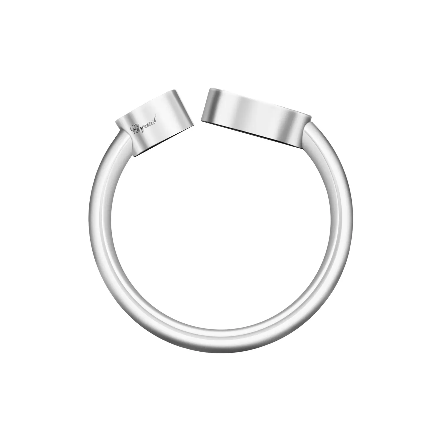 Chiếc nhẫn Chopard Happy Hearts 829482-1910 kết hợp hoàn hảo biểu tượng của tình yêu, ánh sáng và chuyển động. Được chế tác từ vàng trắng 18k, nhẫn được gắn 19 viên kim cương cắt tròn (tổng trọng lượng khoảng 0,18 ct) cùng một viên kim cương chuyển động (khoảng 0,04 ct) lấp lánh giữa hai lớp tinh thể sapphire – đặc trưng của bộ sưu tập Happy Hearts.