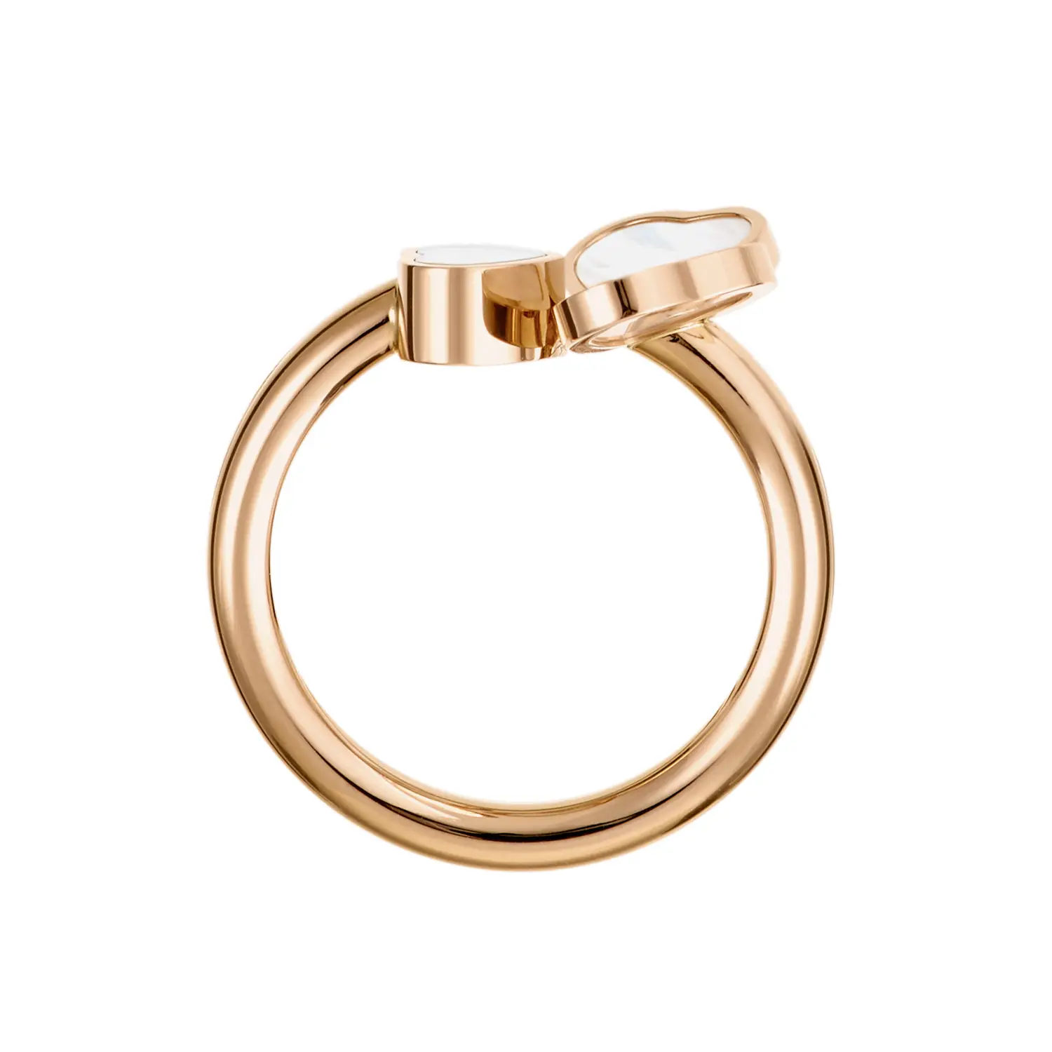 Nhẫn Chopard Happy Hearts Wings 82A083-5312 là biểu tượng của sự thanh thoát, niềm vui và vẻ đẹp nữ tính. Được chế tác từ vàng hồng 18 cara có nguồn gốc đạo đức, chiếc nhẫn được trang trí bằng hai trái tim xà cừ trắng và viên kim cương 0,05 ct chuyển động tự do, lấy cảm hứng từ đôi cánh bướm, tượng trưng cho sự tự do và dịu dàng.