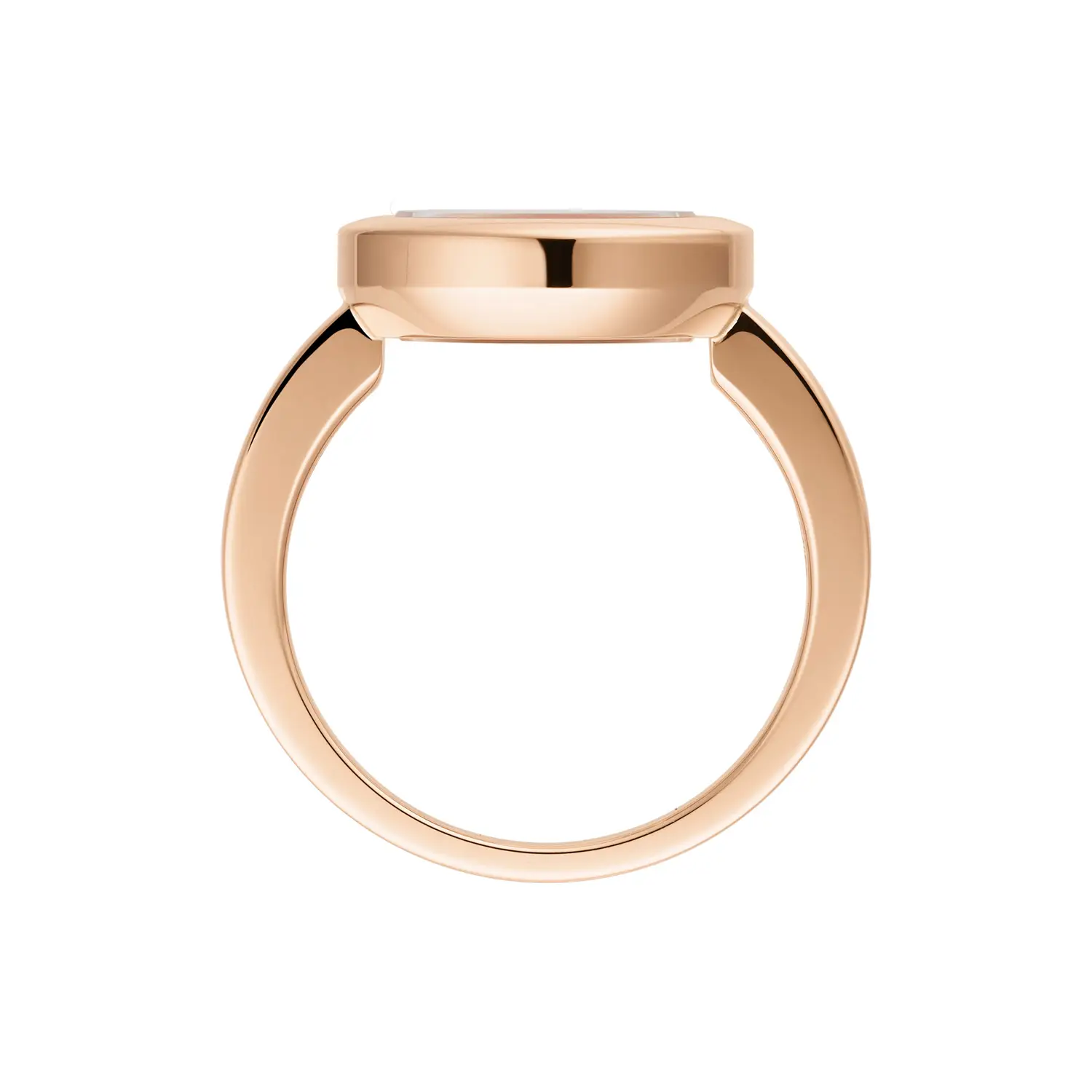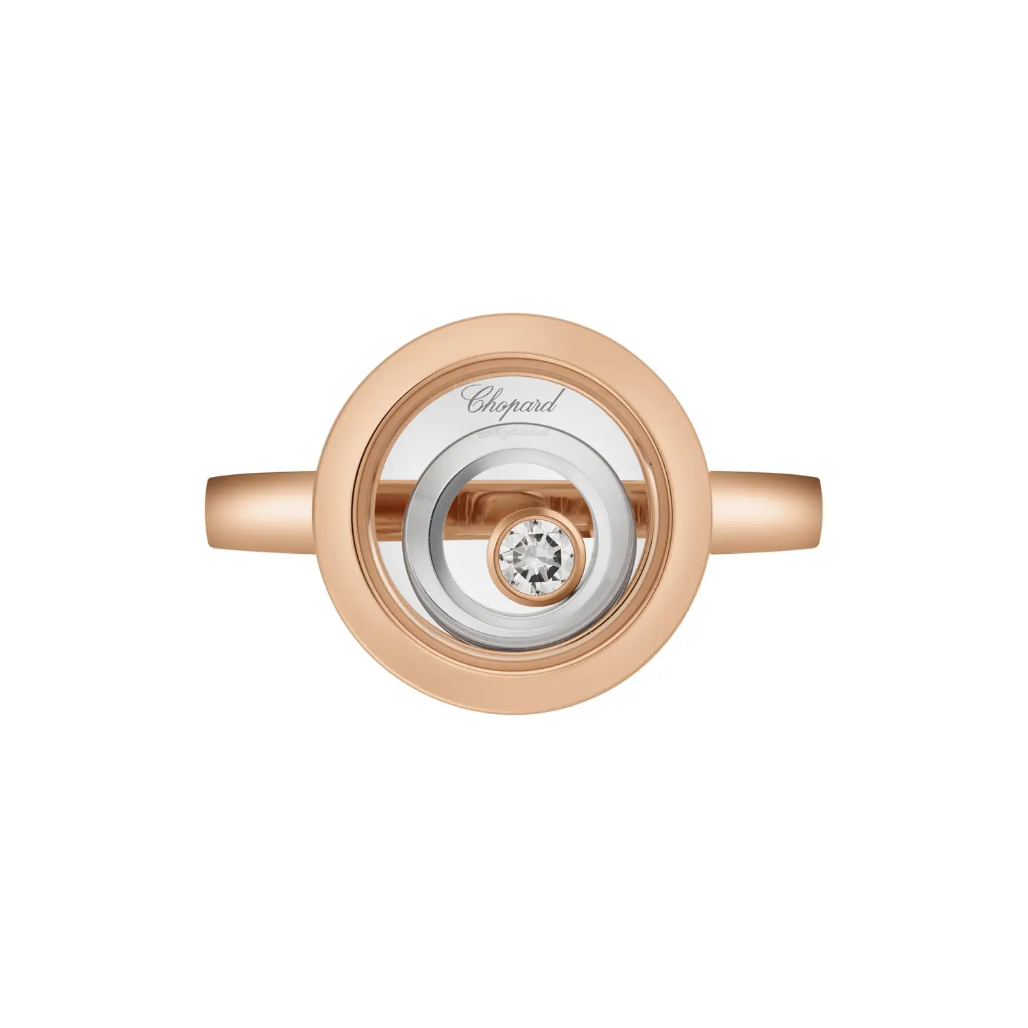 Chiếc nhẫn Chopard Happy Spirit 828230-9010 là tuyệt tác kết hợp giữa sự mềm mại, chuyển động và ánh sáng trong một tổng thể hài hòa. Được chế tác từ vàng hồng và vàng trắng 18k, nhẫn mang thiết kế hình tròn biểu tượng cho sự vĩnh cửu và năng lượng nữ tính. Ở trung tâm là viên kim cương cắt tròn khoảng 0,09 ct, tự do chuyển động giữa hai lớp tinh thể sapphire, phản chiếu ánh sáng lấp lánh.