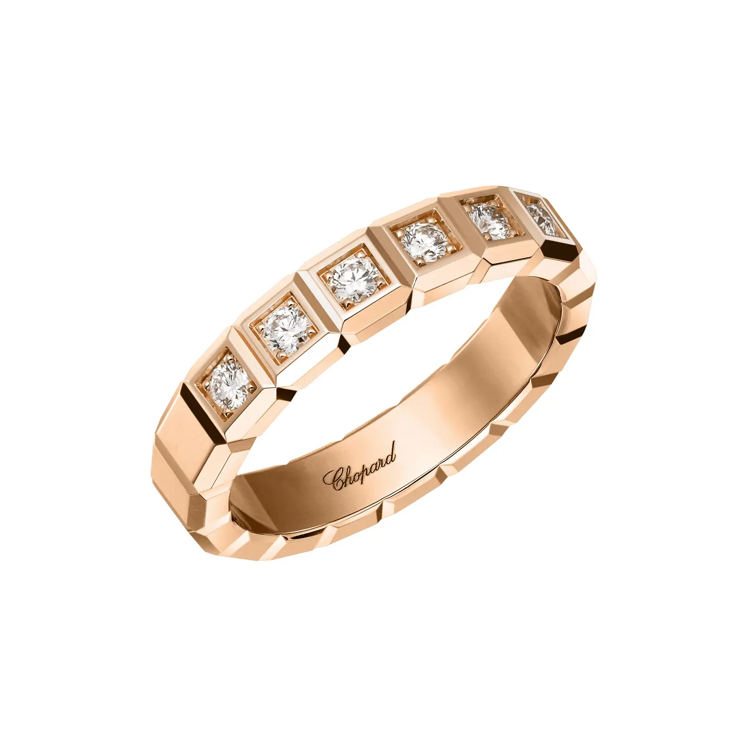 Chiếc nhẫn Chopard Ice Cube được chế tác từ vàng hồng 18k có nguồn gốc đạo đức, thể hiện sự cân bằng hoàn hảo giữa chủ nghĩa tối giản hiện đại và vẻ đẹp xa hoa rực rỡ. Thiết kế lấy cảm hứng từ hình khối lập phương với các đường nét chính xác, được đính kim cương tổng trọng lượng khoảng 0,38 ct, mang đến ánh sáng lấp lánh đầy cuốn hút. Những mặt cắt đánh bóng của vàng hồng phản chiếu ánh sáng trong từng chuyển động, tạo nên hiệu ứng tinh tế như “tác phẩm điêu khắc ánh sáng”.