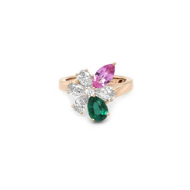 Chiếc nhẫn vàng hồng 18K (750/1000) đánh bóng này là bố cục độc đáo, kết hợp tay nghề xa xỉ với bảng màu đá quý tươi vui. Phong cách trừu tượng, mặt 16,90 × 12,45 mm và cao 4,00 mm tạo nên dáng hình khác biệt, trở thành điểm nhấn khó bỏ qua.