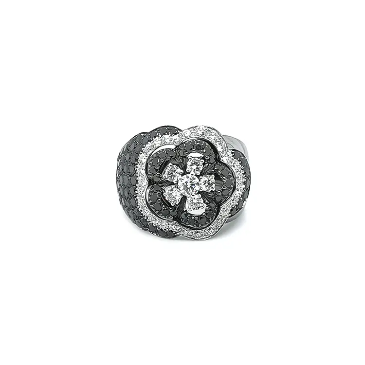 Độ lấp lánh đến từ kim cương đen tự nhiên 1,66 ct (75 viên) cắt tròn Ø 1,80 mm, viền tạo hình bông hoa. Tương phản và độ sáng được tăng cường bởi viền halo kim cương trắng tự nhiên 1,02 ct (31 viên) cắt tròn (Ø 1,55–2,30 mm), độ tinh khiết SI, nước màu G. Kiểu nạm chuẩn xác và sự đối thoại giữa tông tối – sáng tạo nên chiếc nhẫn xa hoa, vượt thời gian và thật sự không thể bỏ qua.