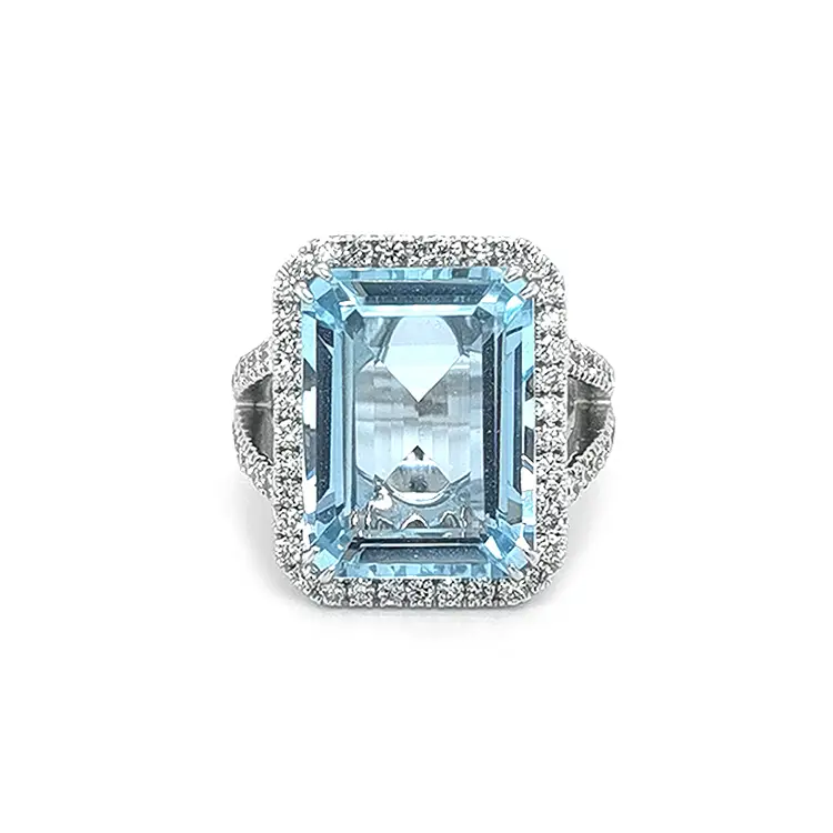 Tâm điểm là aquamarine tự nhiên 10,20 ct (1 viên), cắt Emerald (15,80 × 11,85 mm), xanh lam trong trẻo. Pavé kim cương tự nhiên 0,97 ct (72 viên) cắt tròn (Ø 2,00 mm), màu trắng, độ tinh khiết SI, nước màu G tạo nên độ lấp lánh và tương phản. Kiểu nạm chuẩn xác làm nổi bật chiều sâu của aquamarine và ánh sáng kim cương—mang đến chiếc nhẫn xa hoa, nổi bật và vượt thời gian cho những dịp đặc biệt.