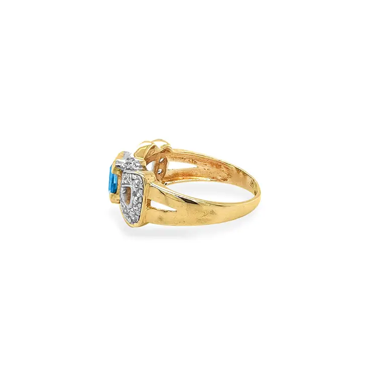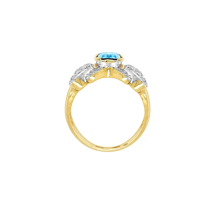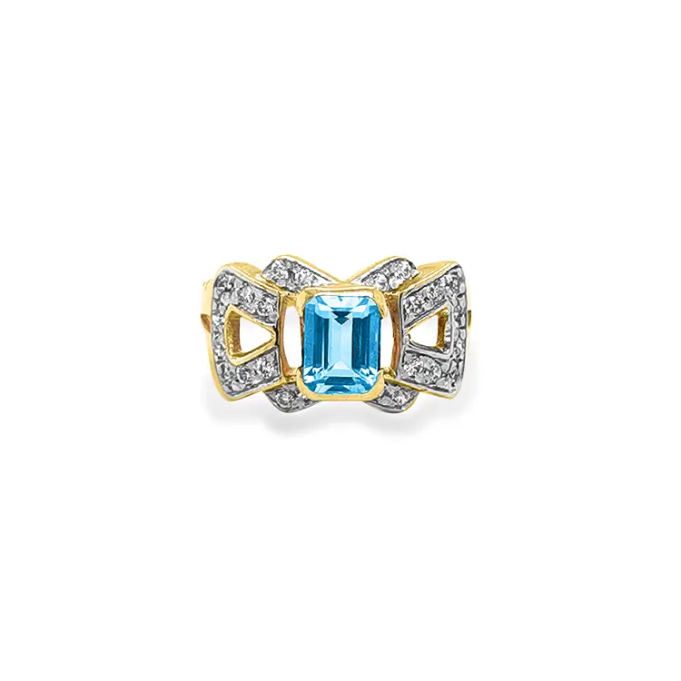 Tâm điểm là 1 viên aquamarine cắt emerald màu xanh biển với kích 6,90 × 5,10 mm, là đá nuôi cấy trong phòng thí nghiệm (lab-grown), mang màu sắc rực rỡ và ánh sáng lấp lánh, tạo cảm giác thanh thoát như nước biển trong xanh.