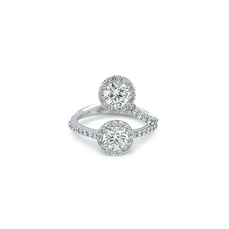 Nhẫn đính hôn vàng đính kim cương chinh phục bằng nét tinh khôi của kiểu halo và sự đối xứng của hai viên chủ. Chế tác từ vàng trắng 18K (750/1000), đánh bóng; cao 5,90 mm nhấn tỷ lệ cân đối. Một bố cục vượt thời gian, trang nhã và trang trọng—lý tưởng cho khoảnh khắc đặc biệt.