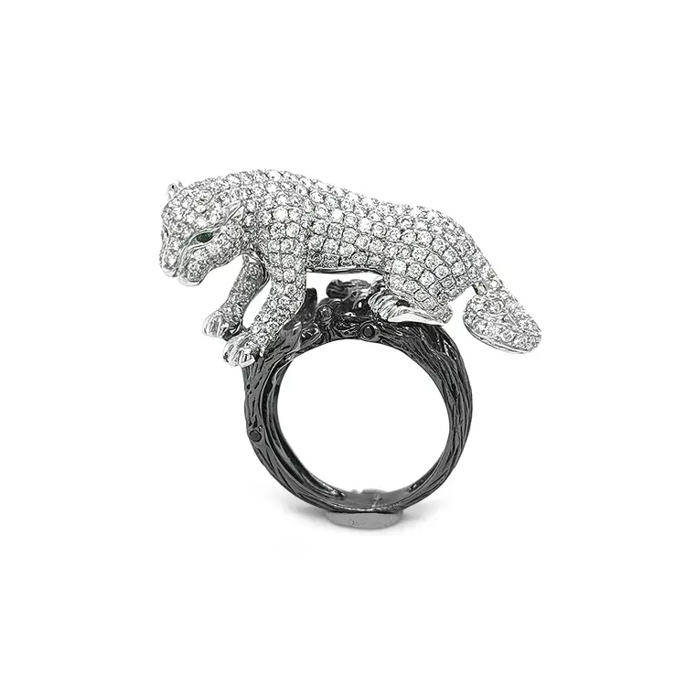 Thiết kế được hoàn thiện bằng hai viên ngọc lục bảo tròn tự nhiên, mỗi viên 1,50 mm, tổng 0,03 ct, mang lại điểm nhấn màu sắc tinh tế. Sắc xanh của ngọc tạo nên sự tương phản thanh lịch với kim cương trắng, tôn lên vẻ đẹp độc đáo của chiếc nhẫn. Đây là lựa chọn lý tưởng cho phụ nữ yêu thích sự sang trọng, chi tiết và phong cách mạnh mẽ.